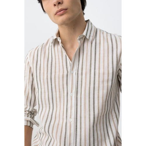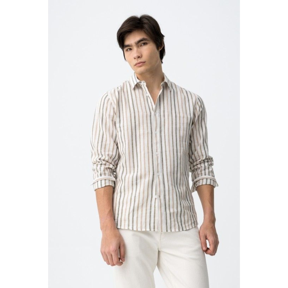 Camisa recta de rayas en tonos verde y beige, con botones blancos y puños ajustados.55% LINEN 45% COTTON