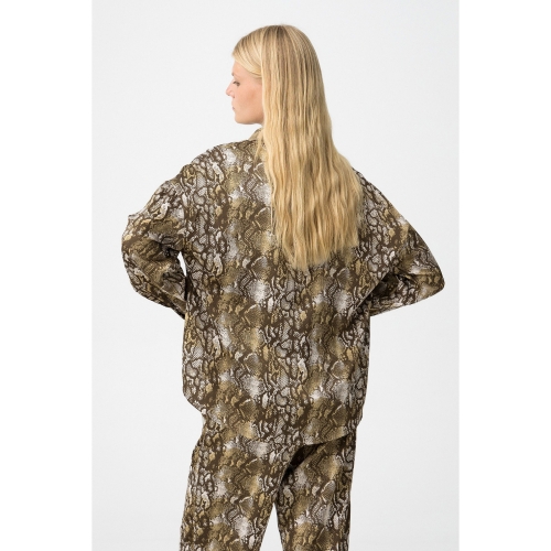 Camisa satinada relaxed fit con estampado animal all over, cuello clásico, cierre de botones y manga larga con puños abotonados.100% POLYESTER