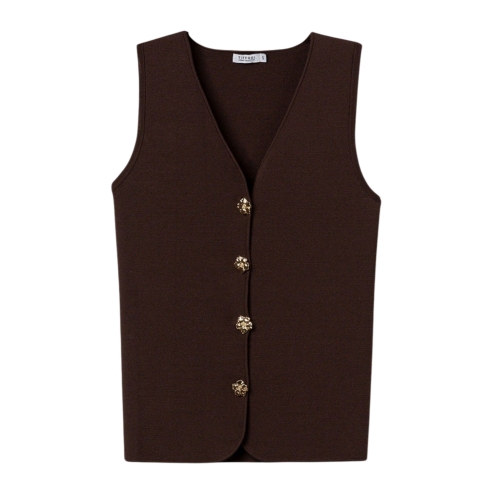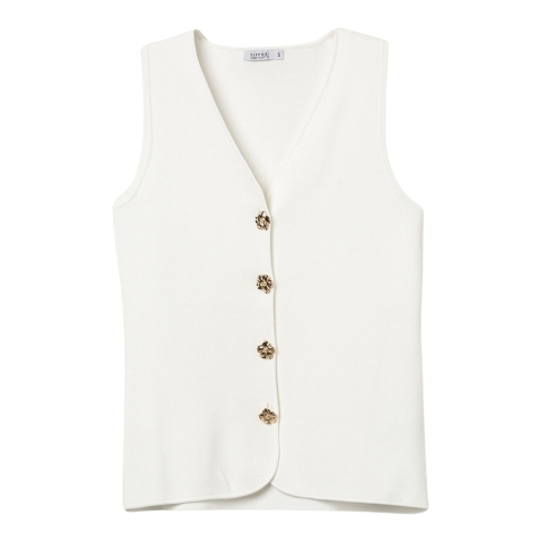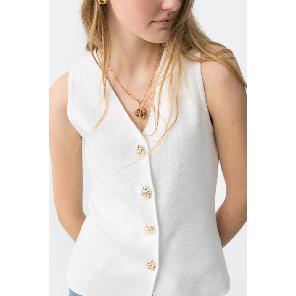 Camiseta de color crudo, corte ajustado, sin mangas, botones dorados decorativos, estilo minimalista actual.