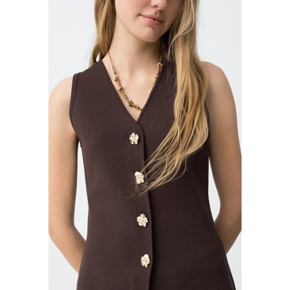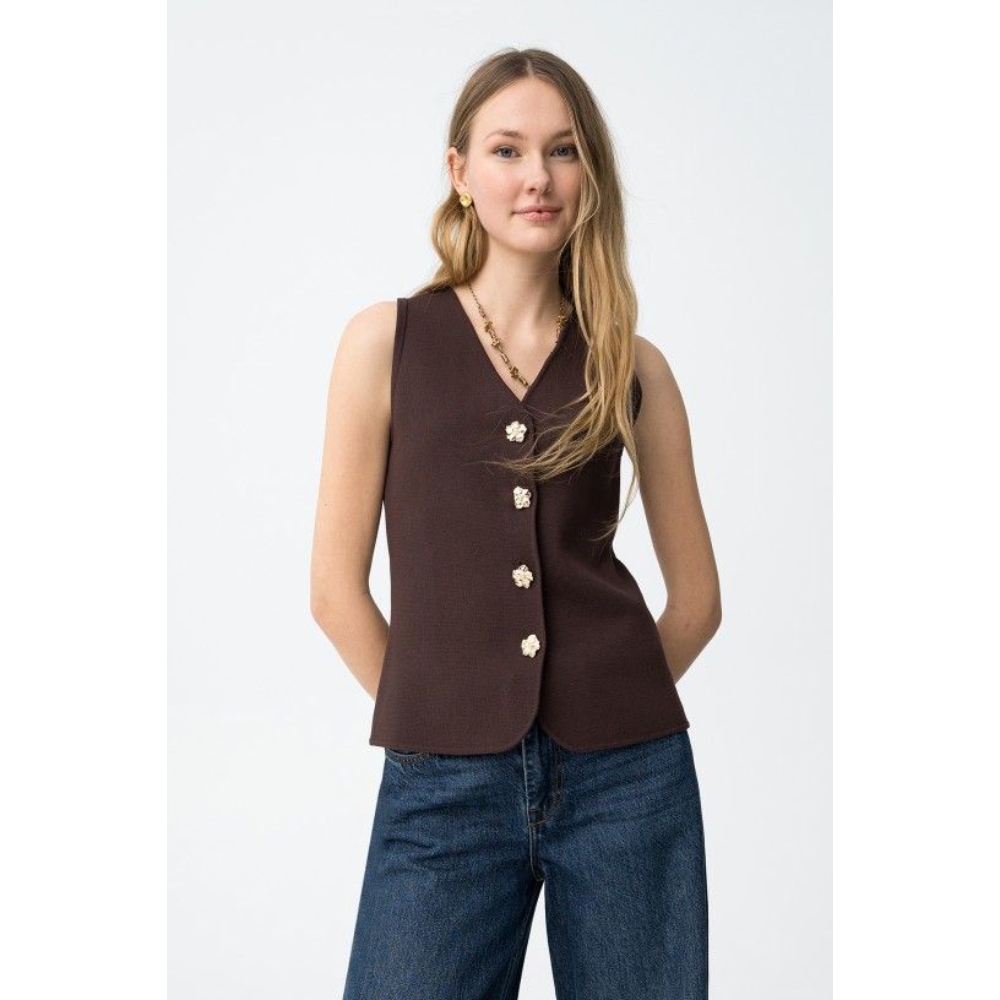 Camiseta de color crudo, corte ajustado, sin mangas, botones dorados decorativos, estilo minimalista actual.