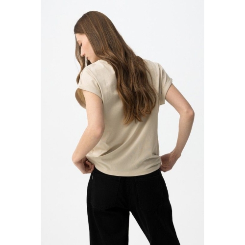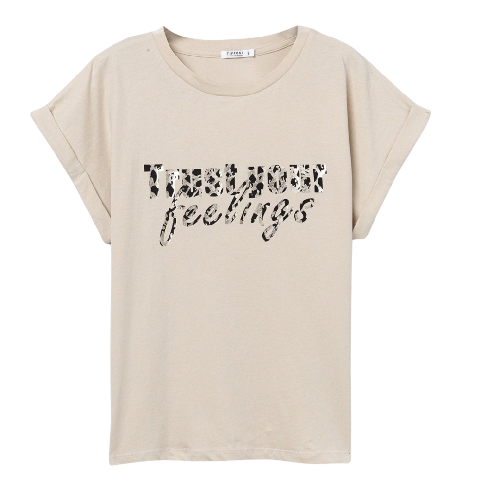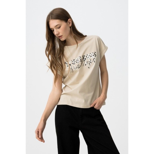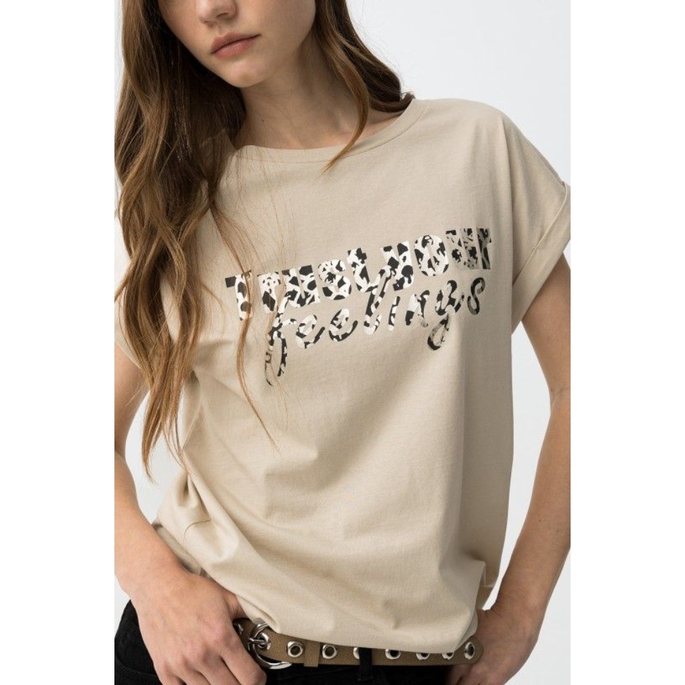 Camiseta de corte regular en beig, manga corta, con estampado gráfico blanco y mensaje frontal.100% COTTON