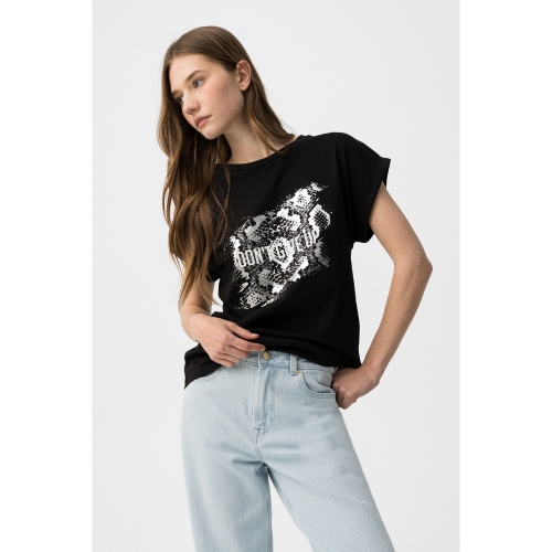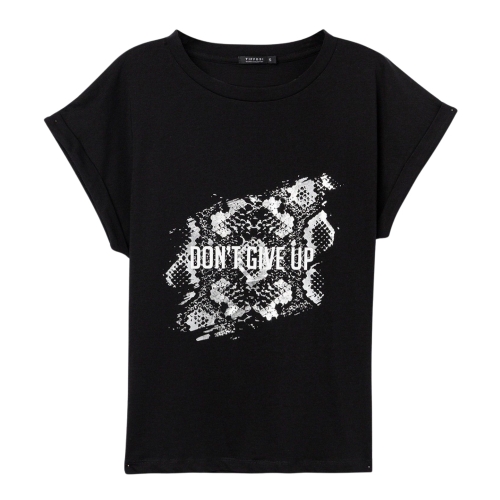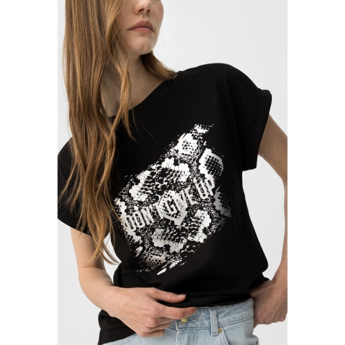 Camiseta de corte regular en negro, manga corta, con estampado gráfico blanco y mensaje frontal.100% COTTON