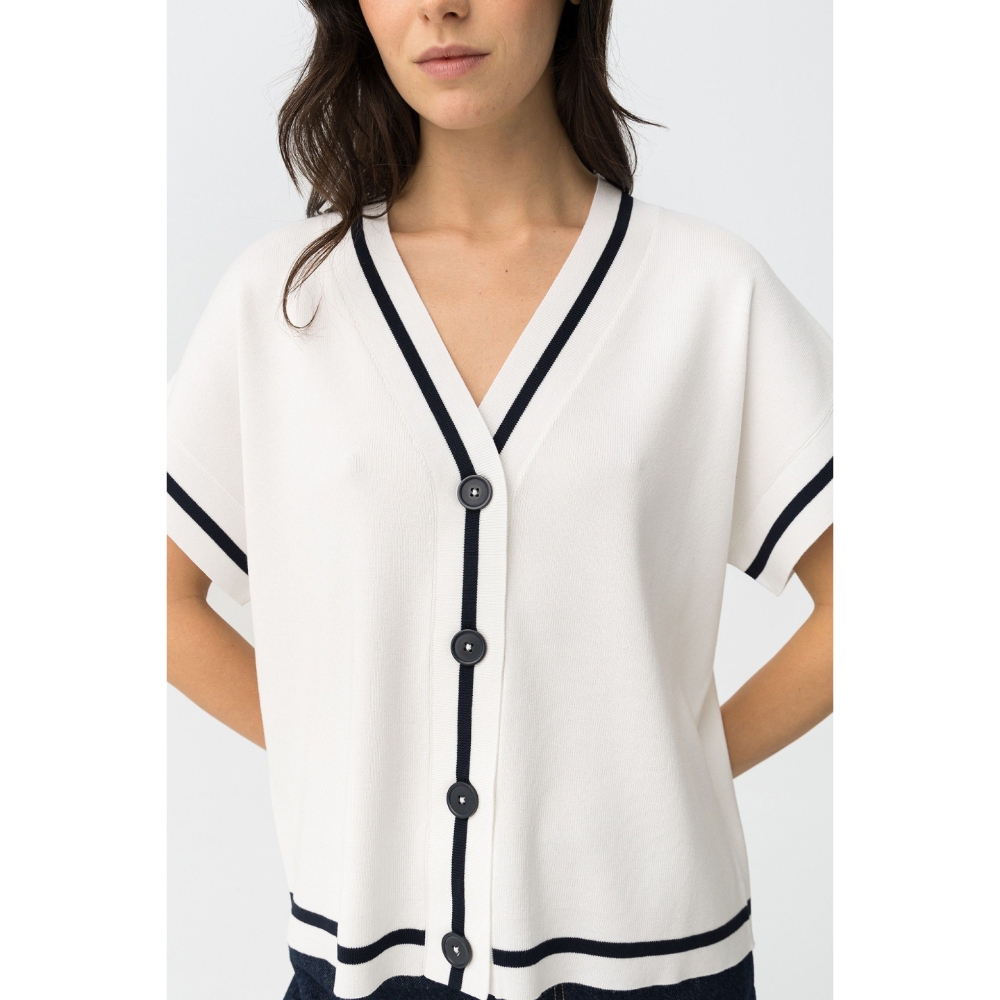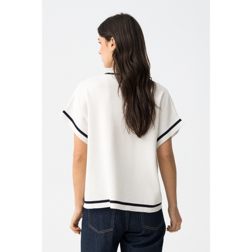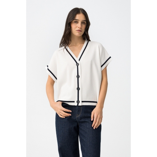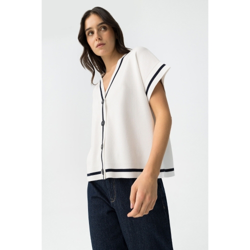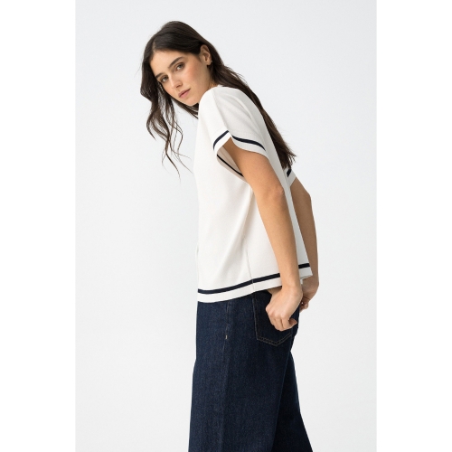 Camiseta de color crudo, corte relaxed, manga corta, botones frontales y detalles en azul marino.70% VISCOSE 30% POLYESTER