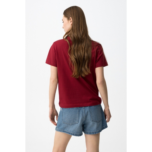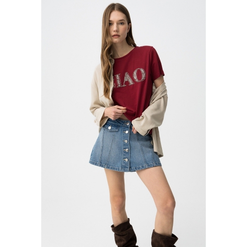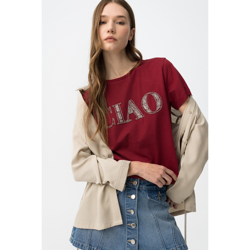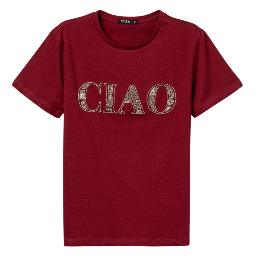 Camiseta roja de manga corta, corte regular, con estampado frontal 'CIAO' en blanco.100% COTTON