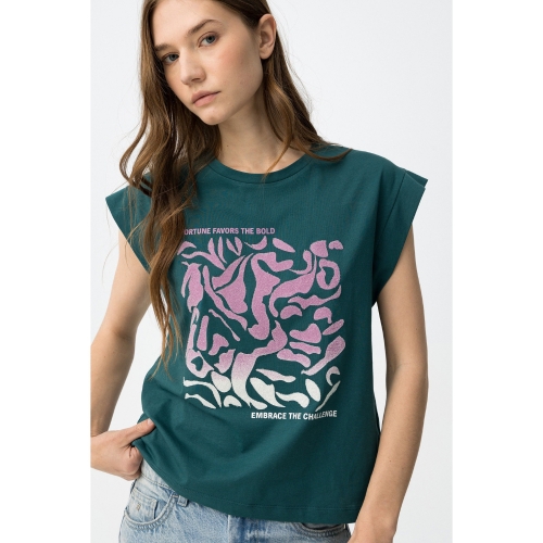 Camiseta verde con diseño gráfico en rosa y blanco. Corte regular y mangas cortas.100% COTTON