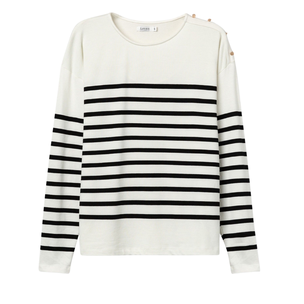Camiseta de manga larga en blanco con rayas negras, corte relajado y botones en el hombro.78% VISCOSE 20% POLYESTER 2% ELASTAN