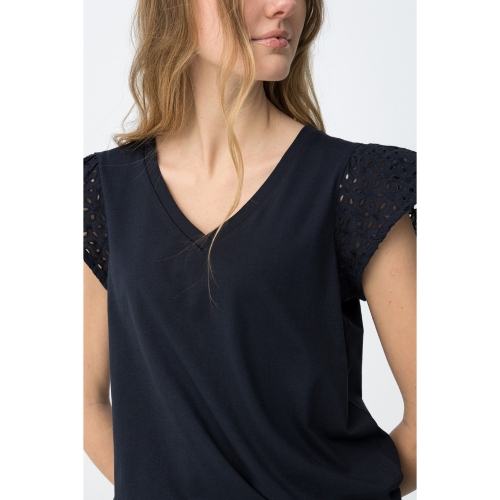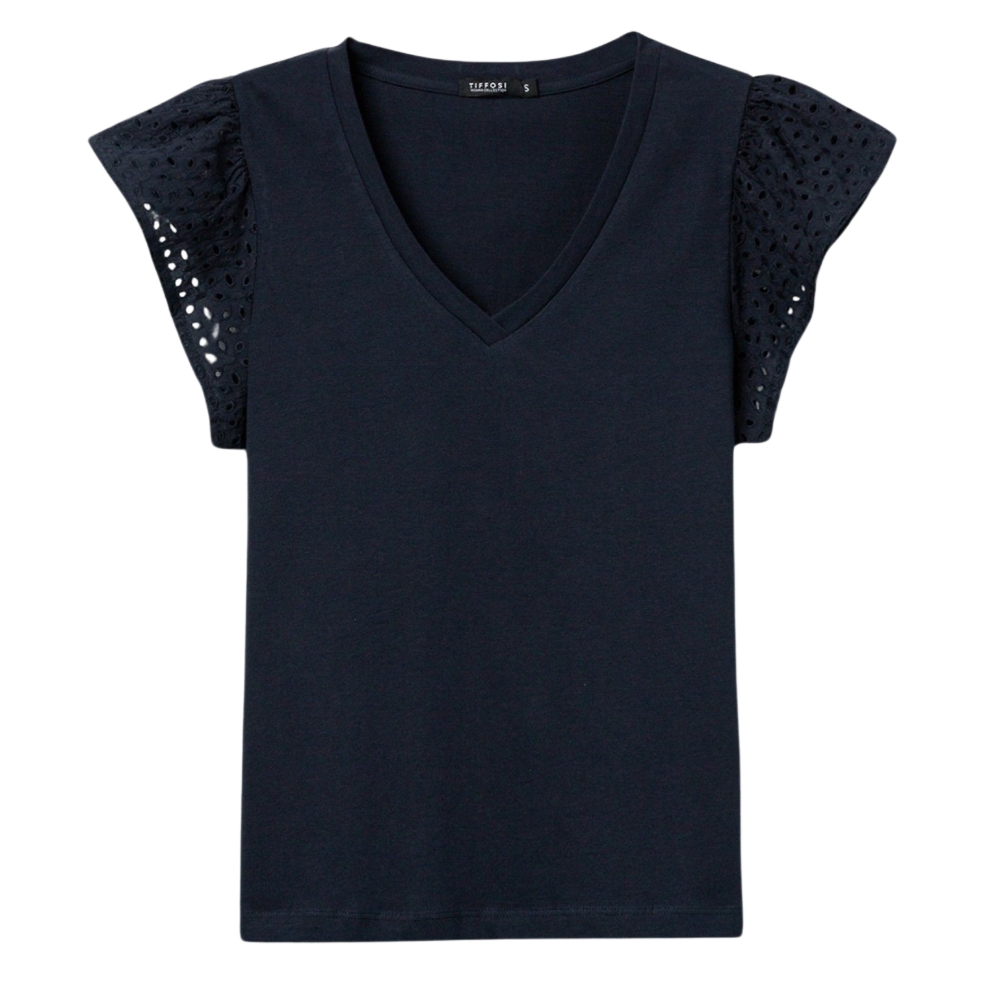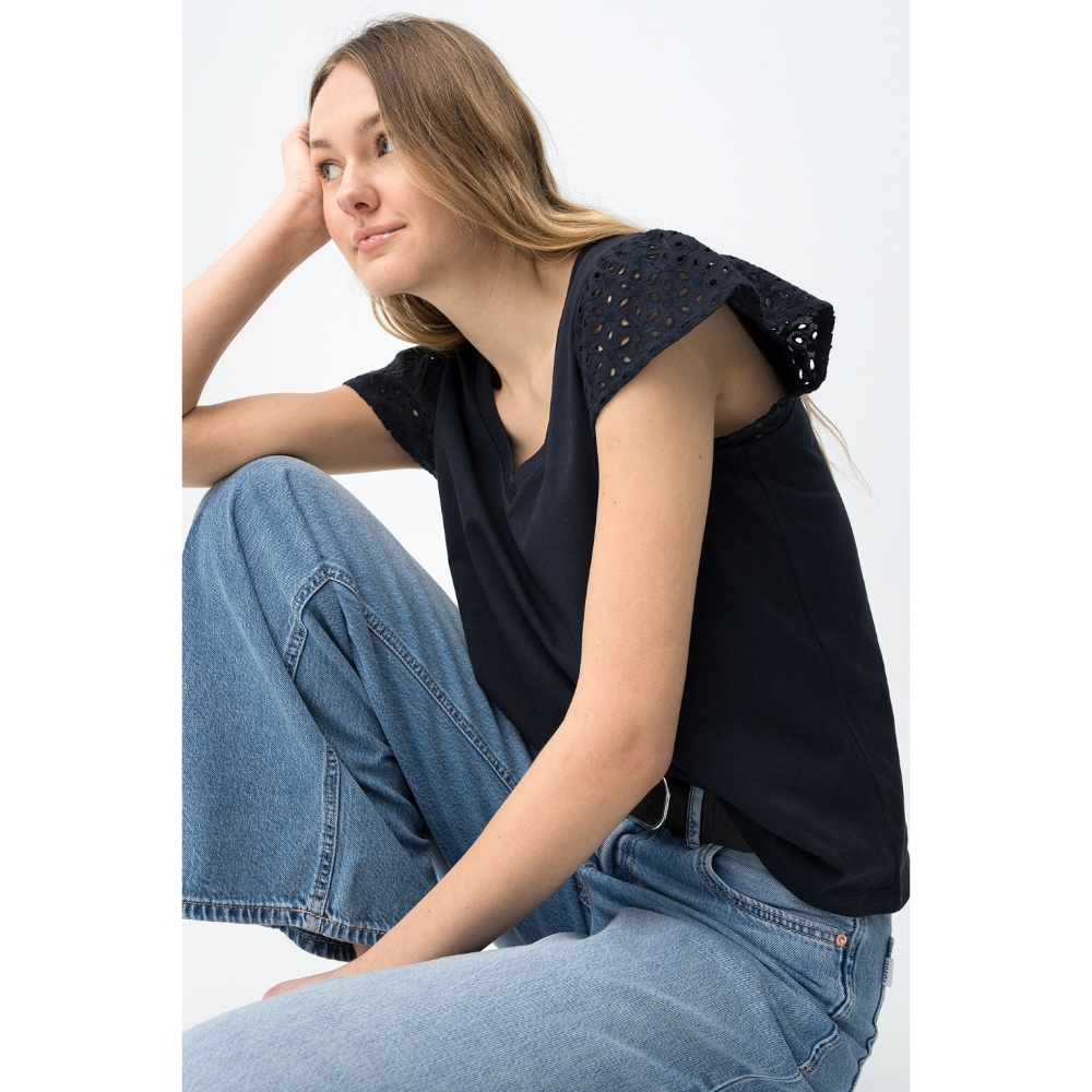 Camiseta rosa de corte regular, escote en V y mangas cortas con detalle calado tipo encaje.100% COTTON