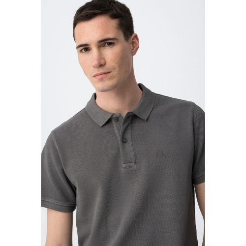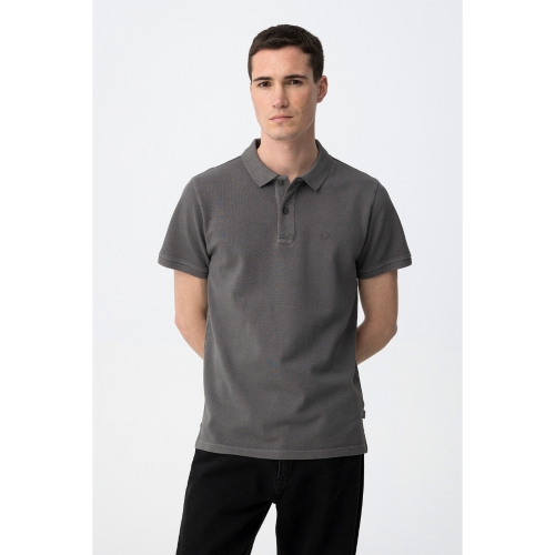 Corte clásico, color gris oscuro, cuello clásico y cierre de dos botones, detalle minimalista en el pecho.100% COTTON