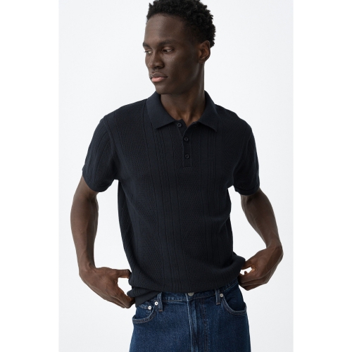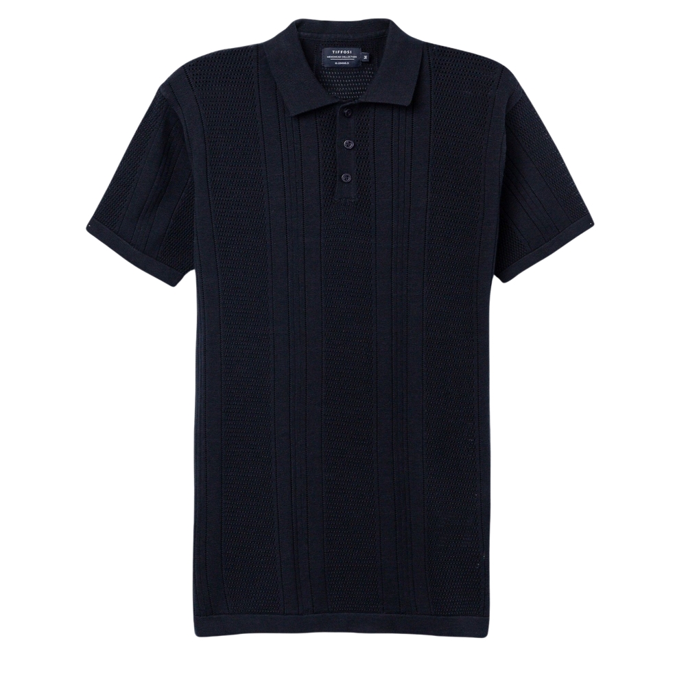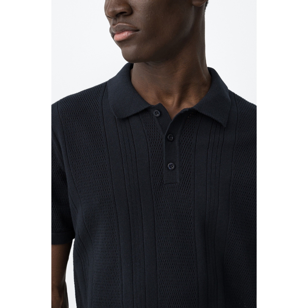 Camiseta de manga corta en azul oscuro, corte recto, cuello polo y botones visibles.100% COTTON