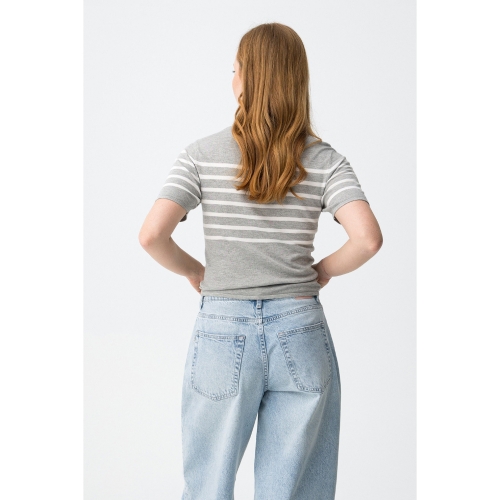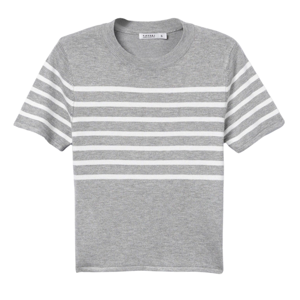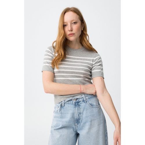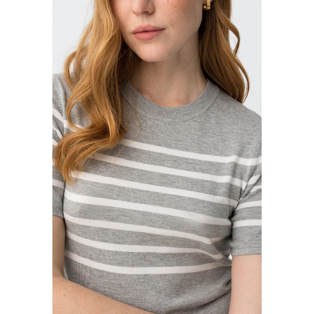 Camiseta de manga corta en gris claro con rayas blancas, corte slim y punto suave.80% VISCOSE 20% POLYAMIDE