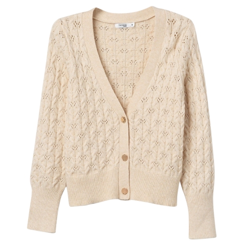 Cárdigan de punto con estampado de encaje. Manga larga con puños y cinturilla en acabado canelado. Escote en V y cierre frontal con botones de contraste. Textura decorativa en relieve.