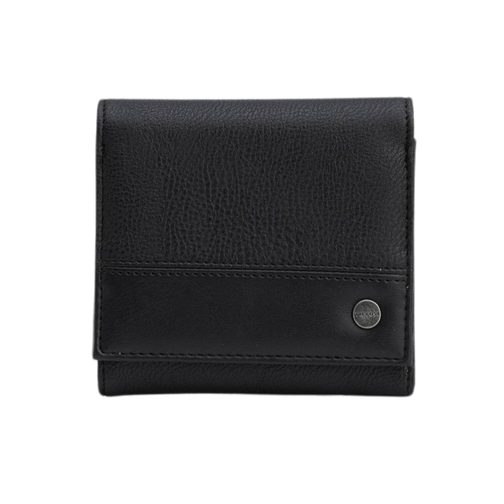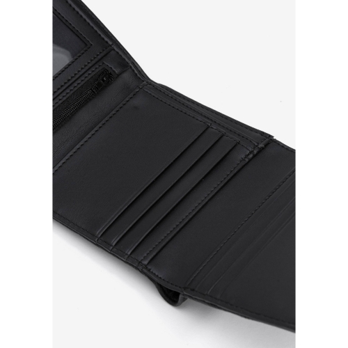 Monedero mediano liso con apertura con solapa con botón y bolsillo interior con cremallera. Compartimentos para tarjetas en el interior.