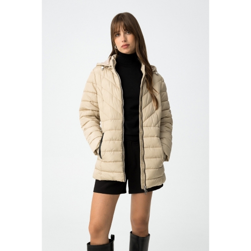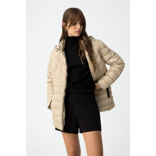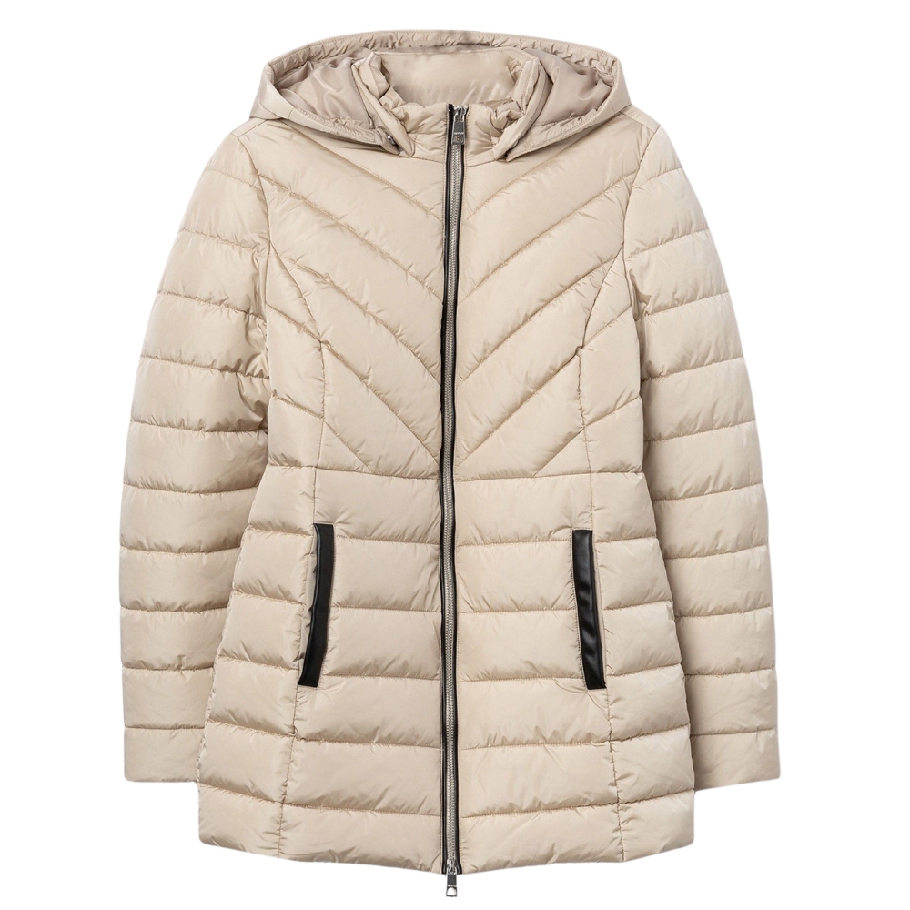 Cazadora acolchada regular fit, con dos bolsillos frontales, contrastes efecto piel y cierre de cremallera. Capucha ajustable y desmontable. Cuello alto y manga larga con puños de canalé.
