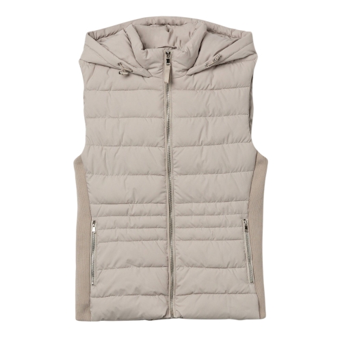Chaleco acolchado con capucha ajustable y cremallera frontal. Bolsillos con cierre. Parte delantera y trasera en tejido liso laterales en punto acanalado.