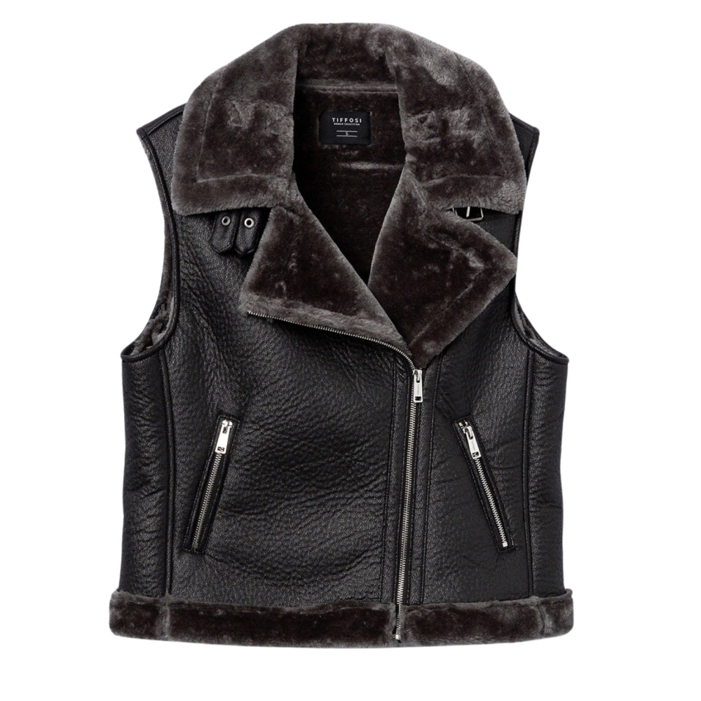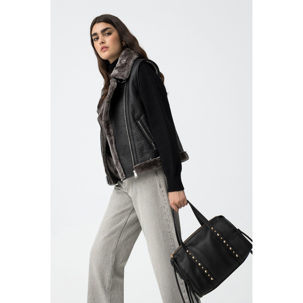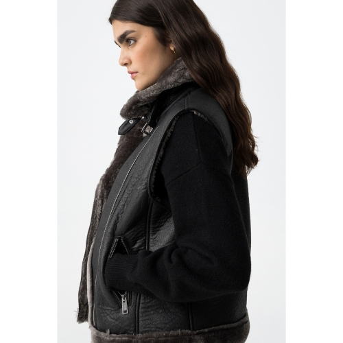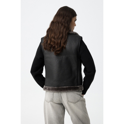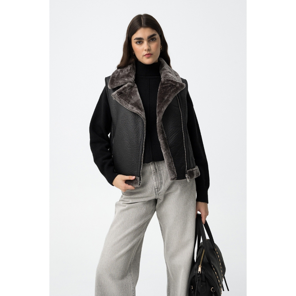 Chaleco regular fit de efecto piel combinado con pelo sintético, con dos bolsillos delanteros, cuello con hebilla y sisa.100% POLYURETHANE