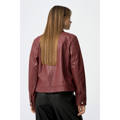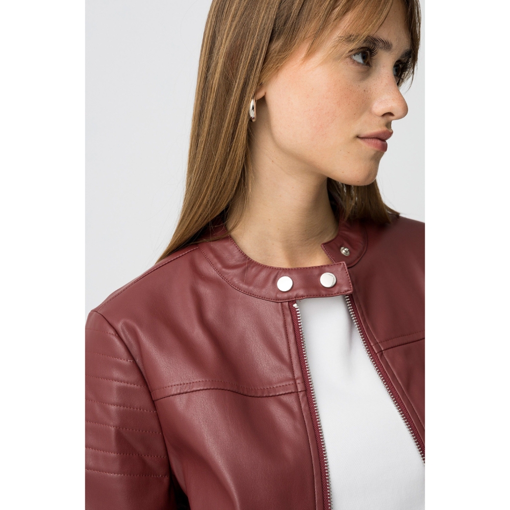 Chaqueta efecto piel regular fit, con cierre de botón de presión en el cuello y dos bolsillos frontales. Apertura frontal con cremallera y mangas largas con botones en los puños.