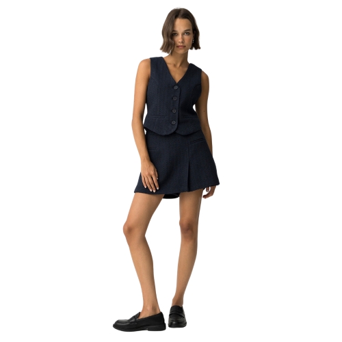 Falda pantalón de tweed azul oscuro, talle alto, cierre lateral con cremallera y detalles decorativos. Corte ajustado.100% poliéster.