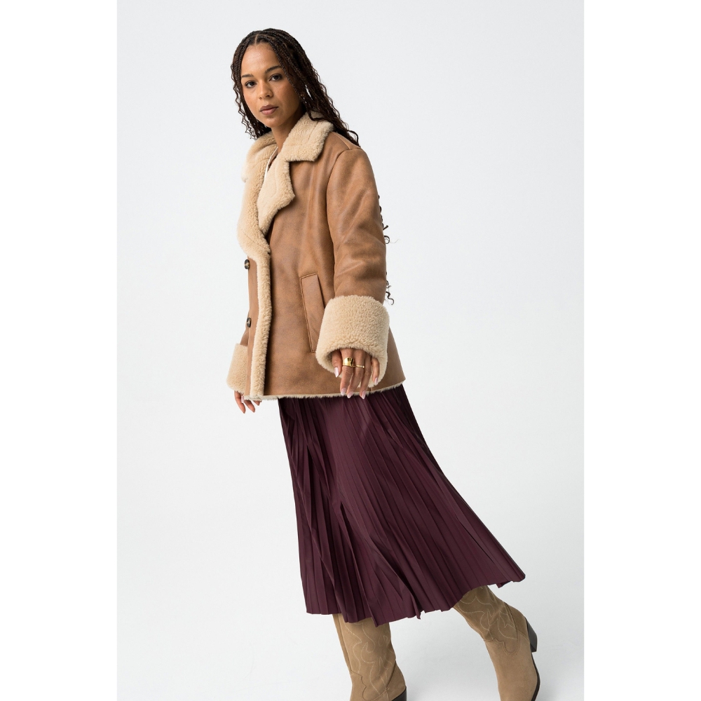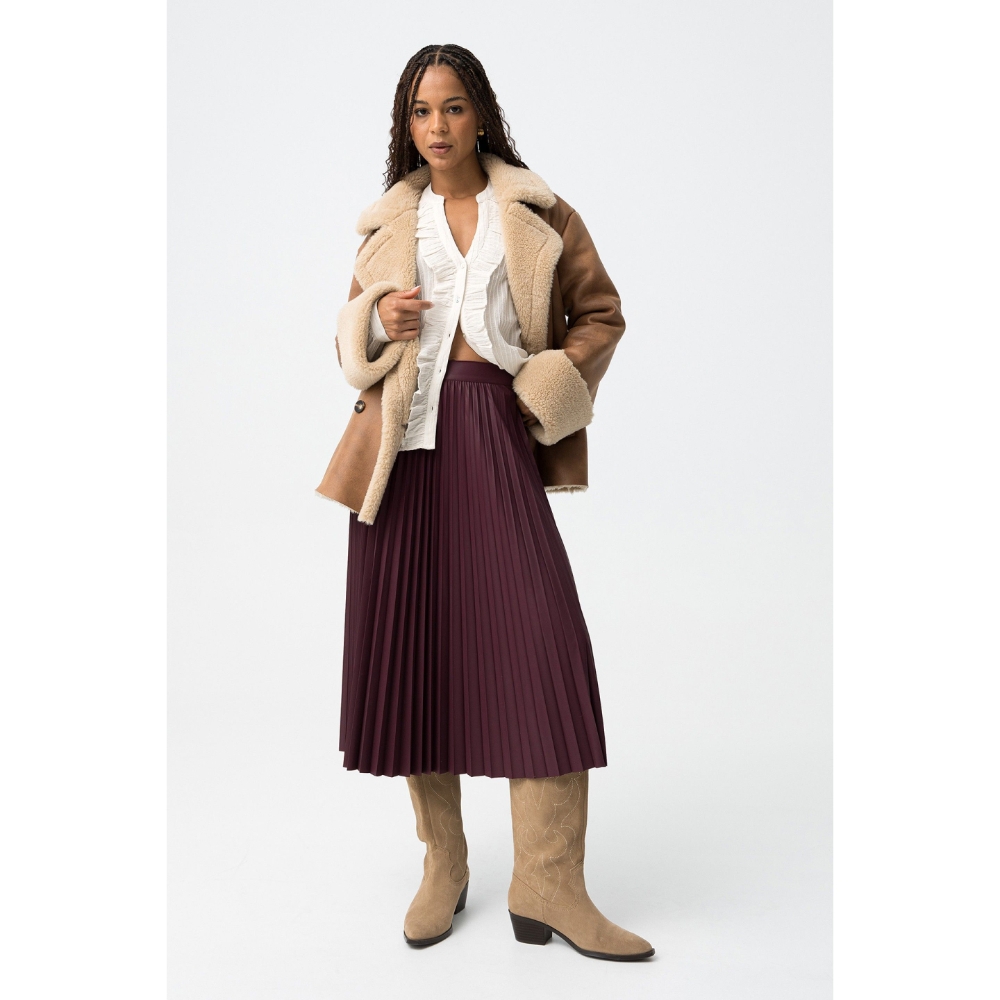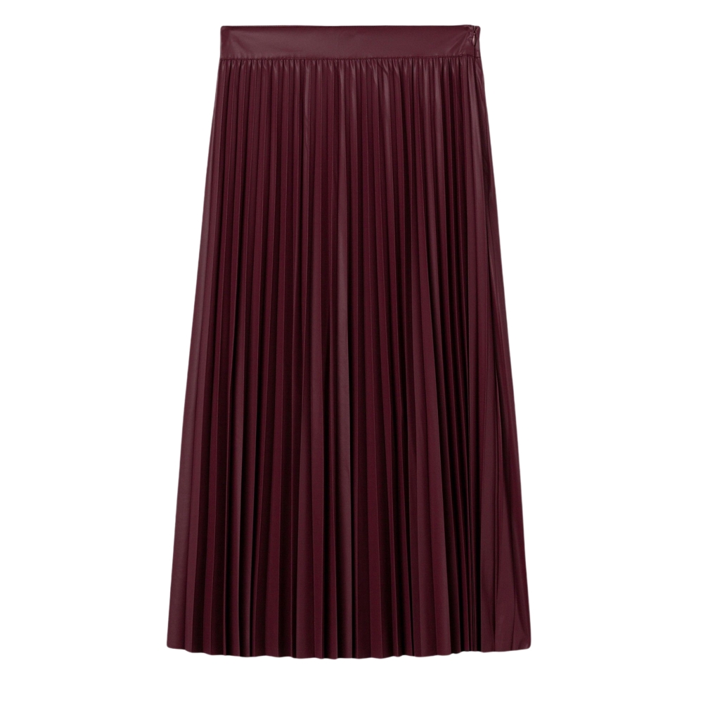 Falda midi plisada efecto piel, con cierre de cremallera lateral.100% POLYURETHANE