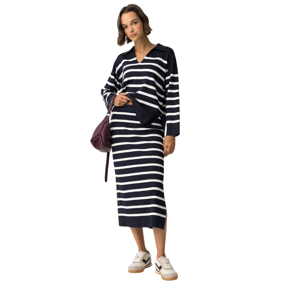 Falda midi de punto a rayas, con cintura elástica alta y abertura lateral en la parte inferior.70% VISCOSE 30% POLYESTER