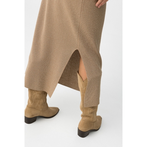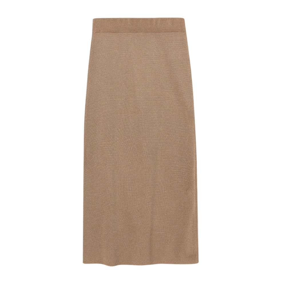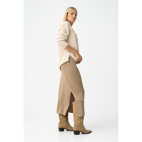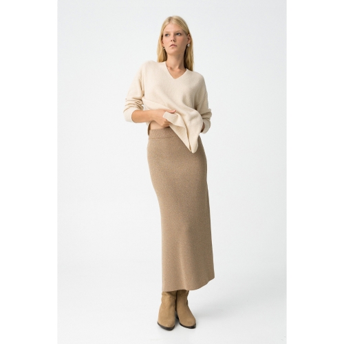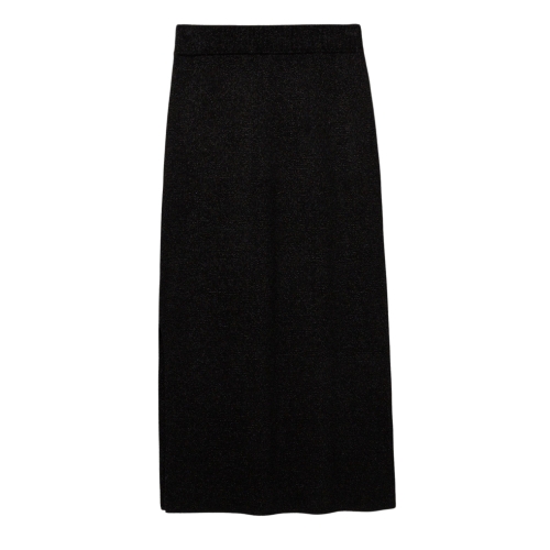 Falda midi de punto con hilo metálico integrado. Cintura alta elástica y bajo con abertura.80% VISCOSE 20% METALLIC FIBER