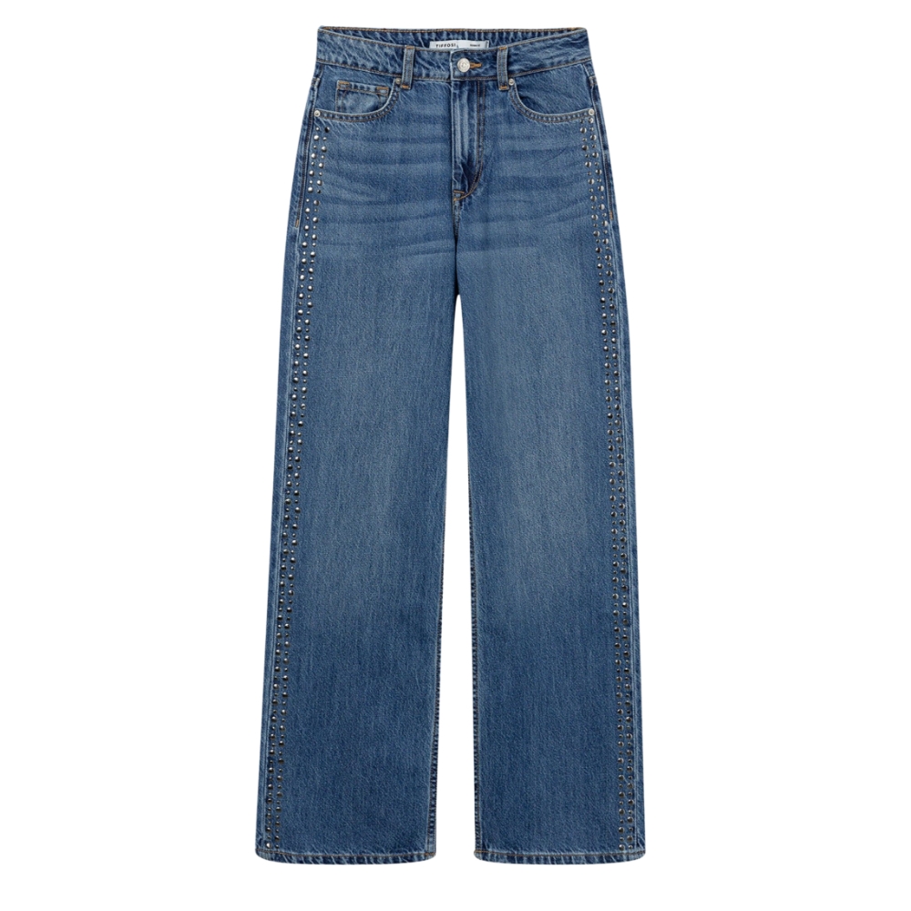 Jeans de pierna ancha con aplicaciones metálicas, cintura alta y cinco bolsillos. Cierre frontal con cremallera y botón metálico.100% COTTON