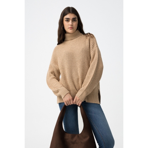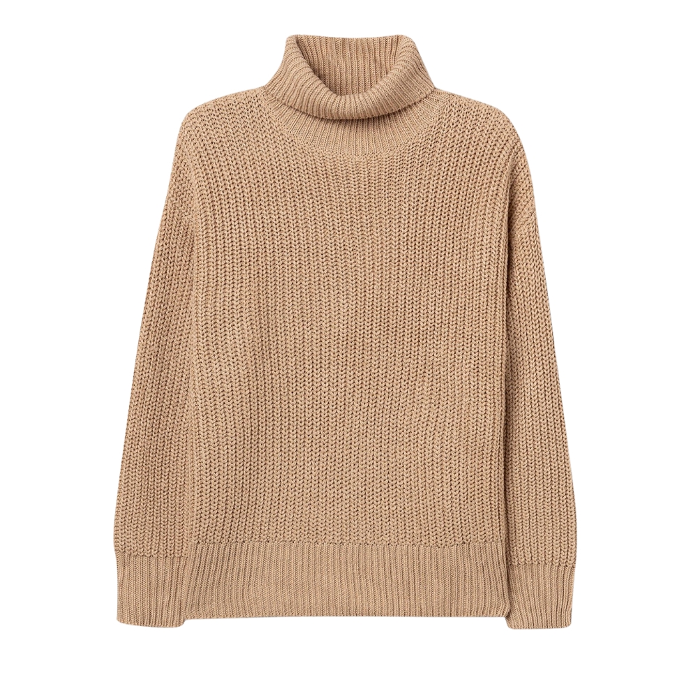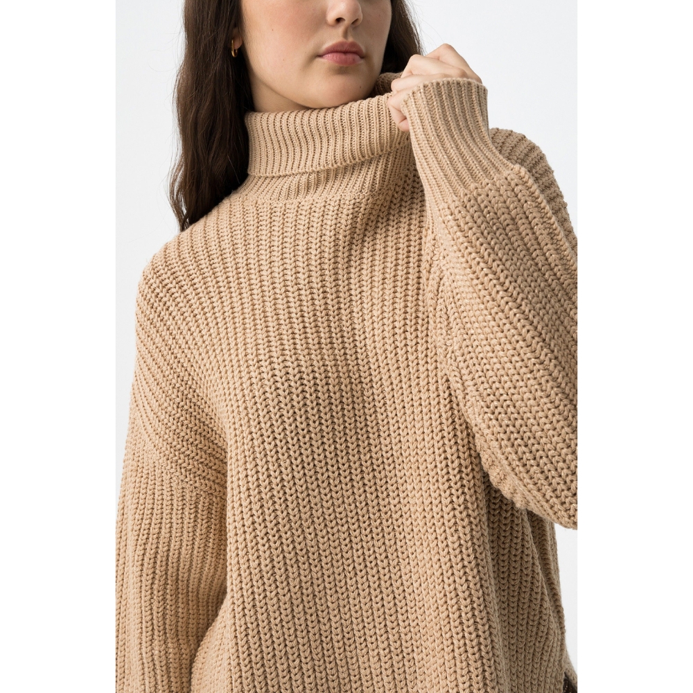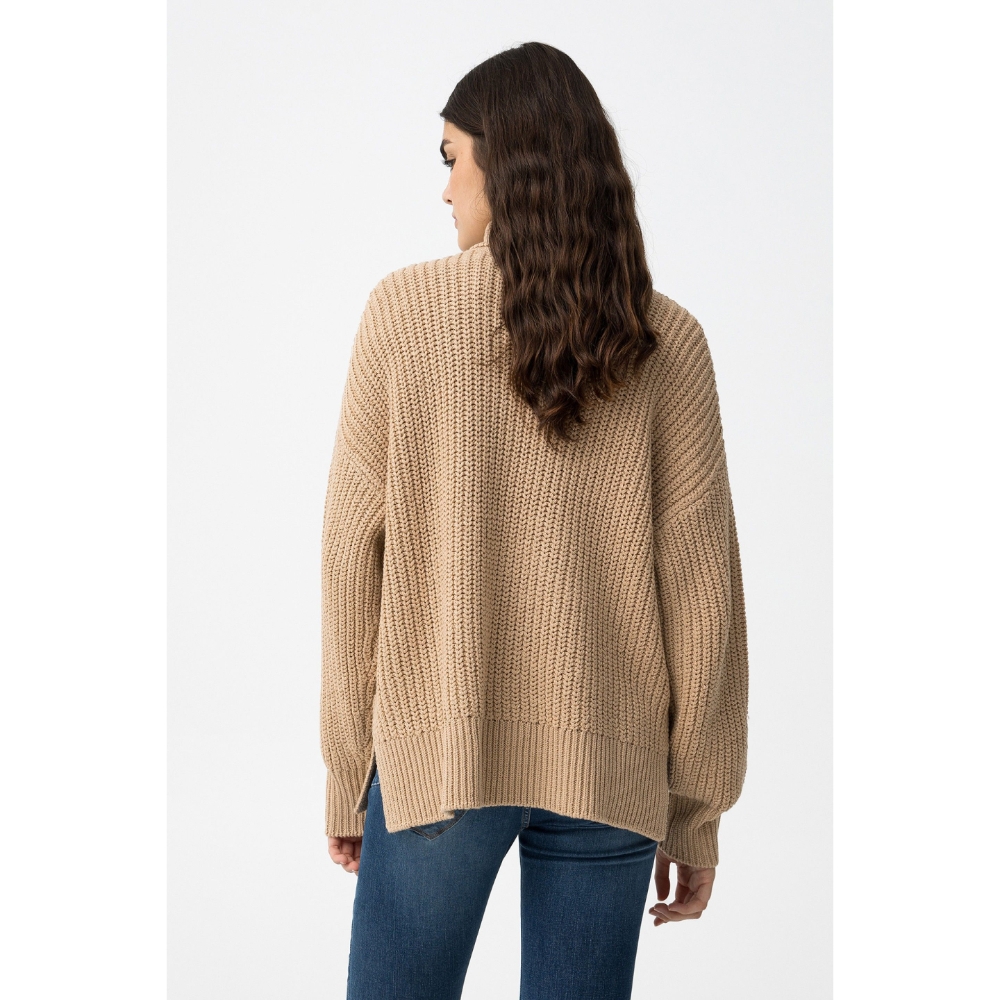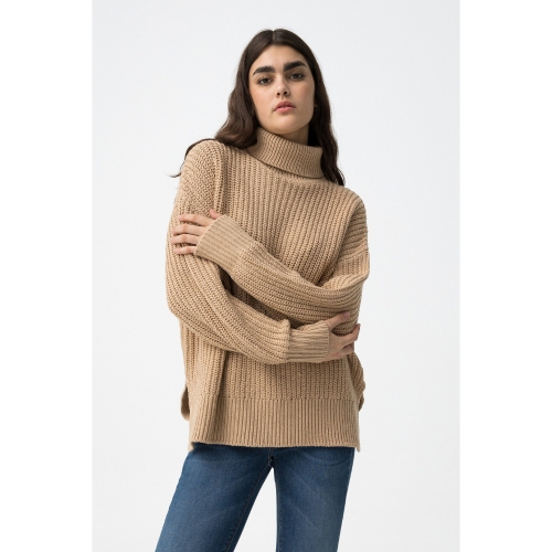Jersey oversized de punto grueso con cuello alto estructurado. Rib en cuello, puños y bajo. Tejido uniforme y silueta voluminosa.
