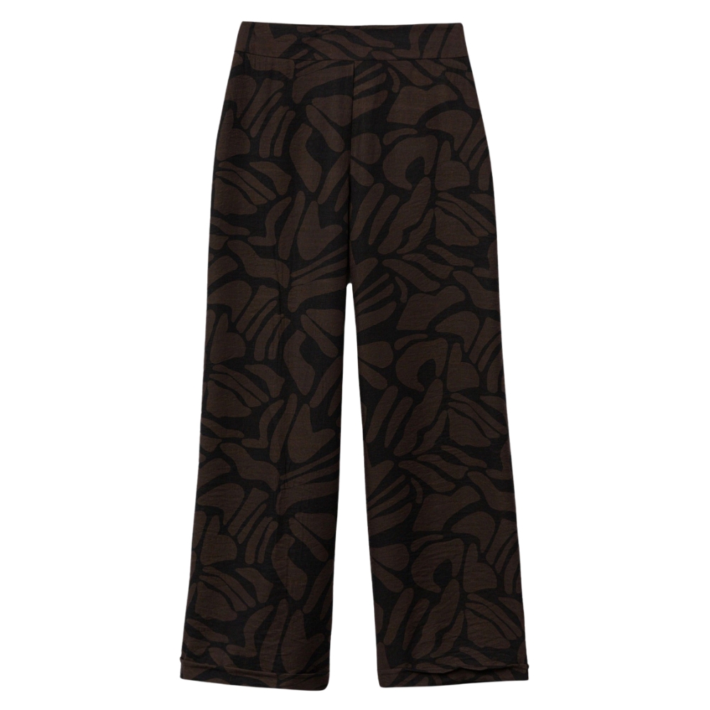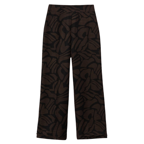 Pantalón de corte ancho en negro con estampado abstracto, cintura alta y estilo casual moderno.80% VISCOSE 20% POLYAMIDE