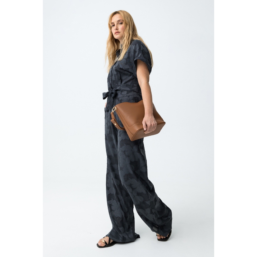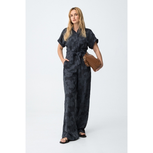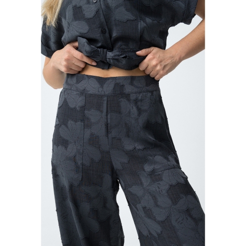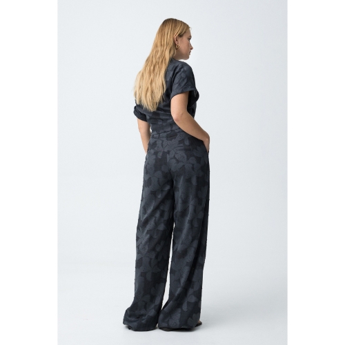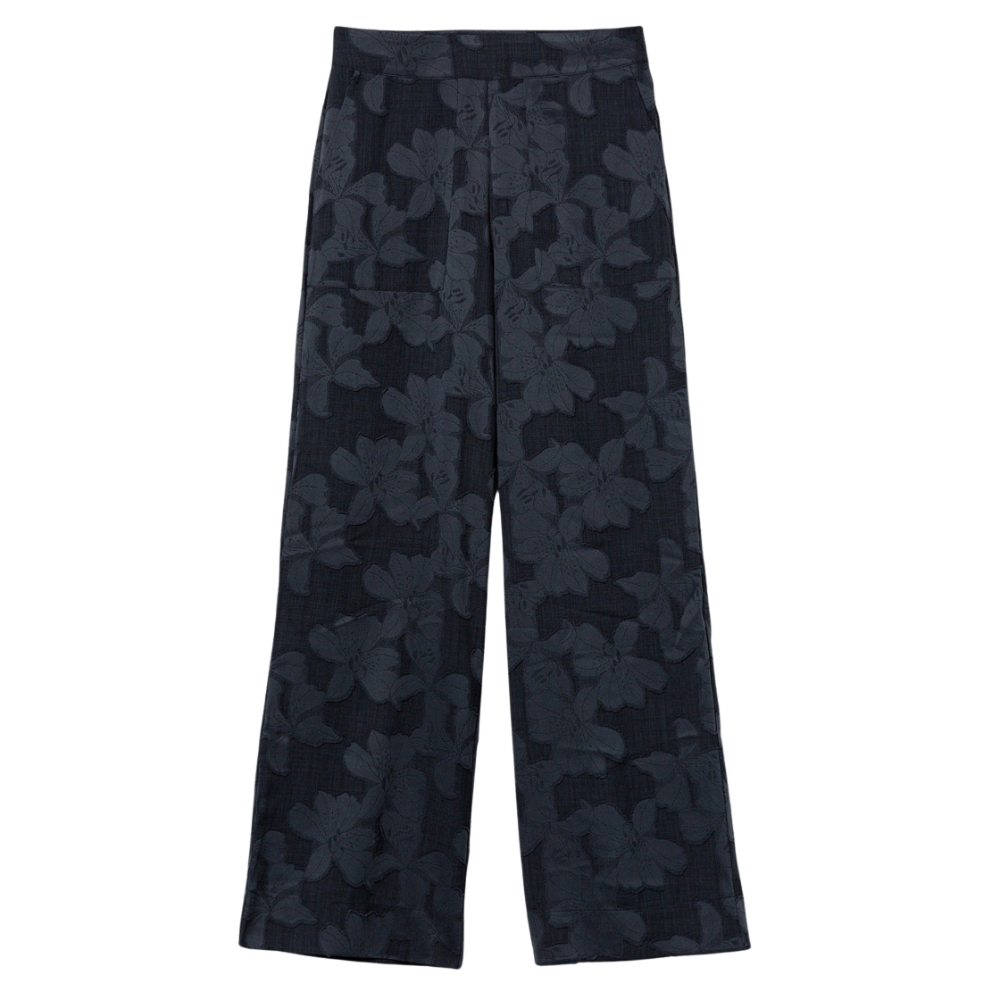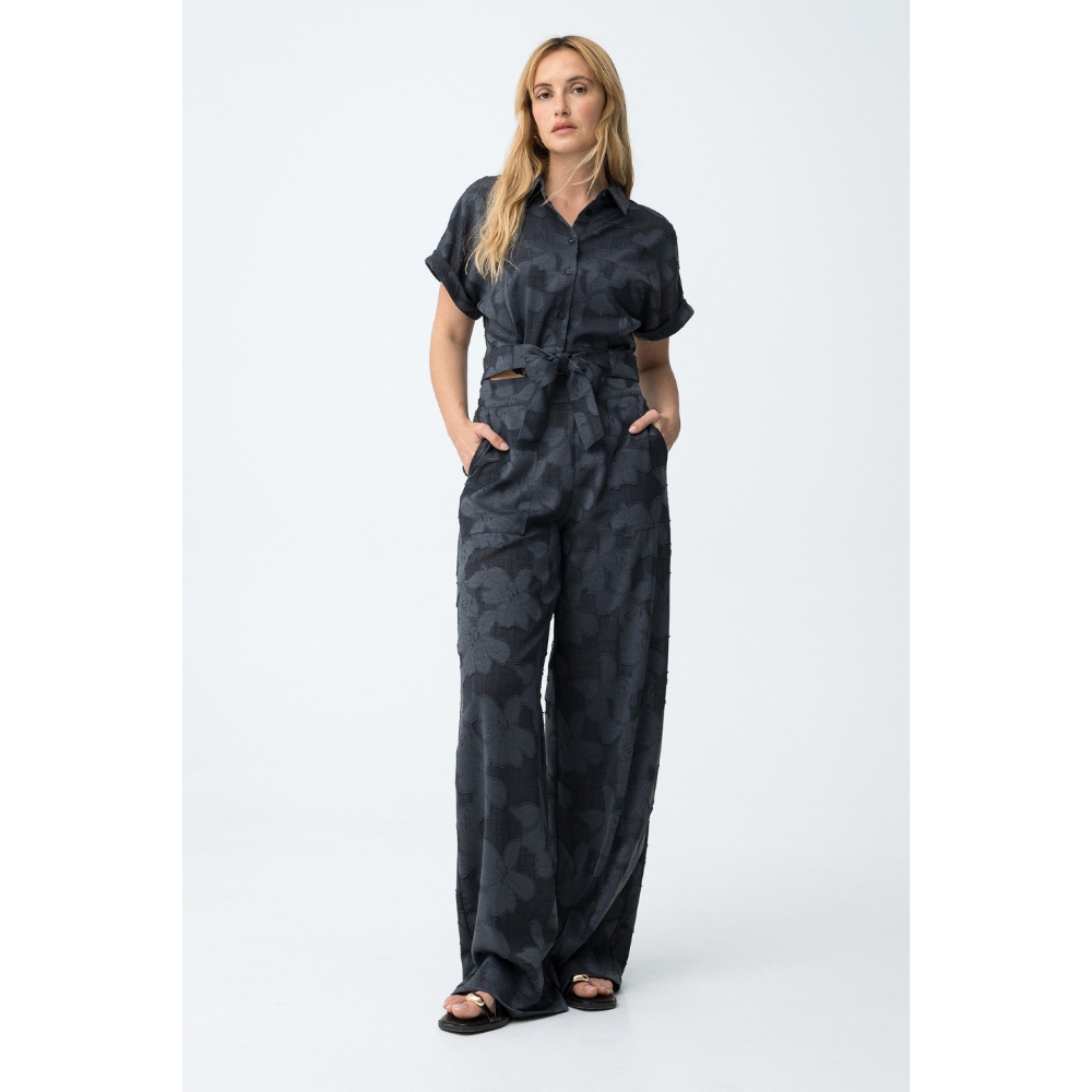 Pantalón largo azul oscuro corte holgado, tiro alto, cinturón y bolsillos laterales, con estampado sutil.100% POLYESTER