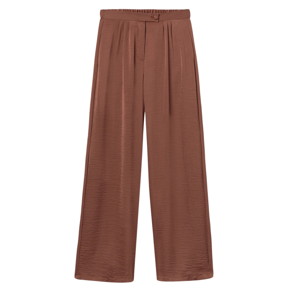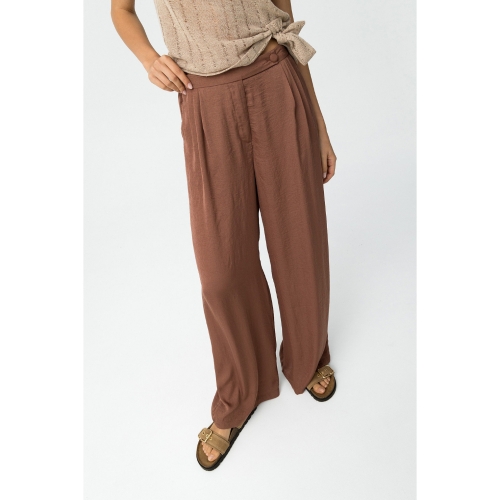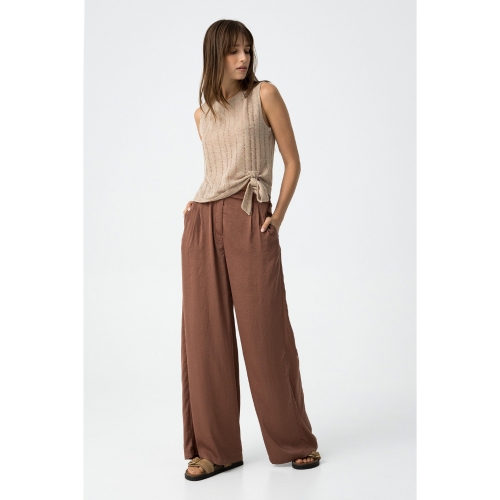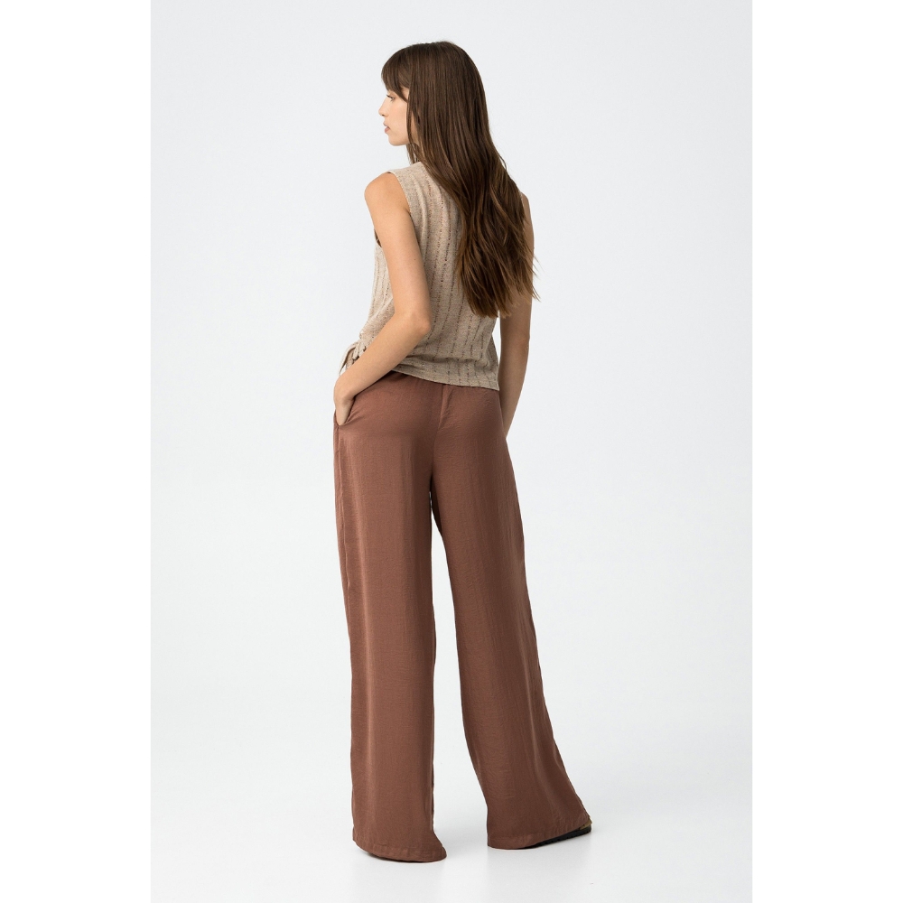 Pantalones palazzo fluidos en tono marrón con textura. Cintura elástica y bolsillos frontales.100% POLYESTER