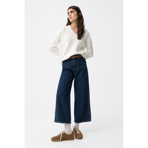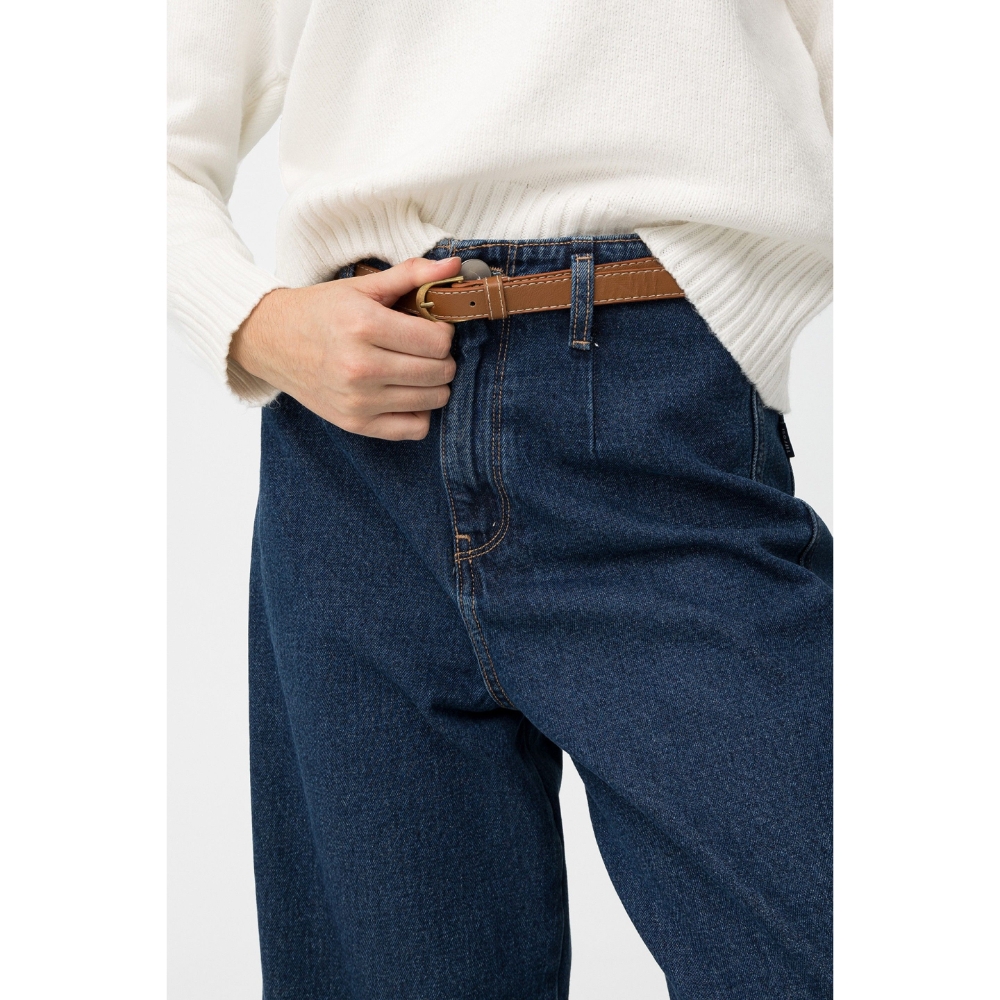 Jeans straight fit de tiro alto. Cinturón incorporado en la cintura, en denim con hebillas ajustables. Cinco bolsillos funcionales — dos delanteros, dos traseros y uno pequeño. Cierre frontal con cremallera y botón metálico.
