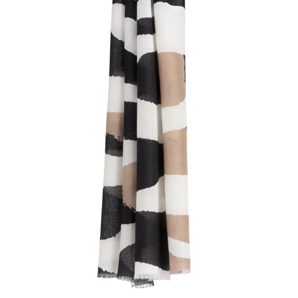 Pañuelo estampado de cebra tricolor, con acabado deshilachado.100% POLYESTER