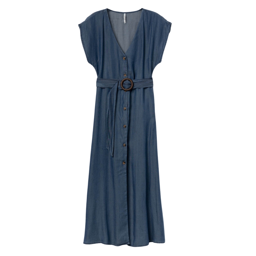 Vestido denim con escote en pico y manga corta. Cierre de botón y cinturón con hebilla de madera.