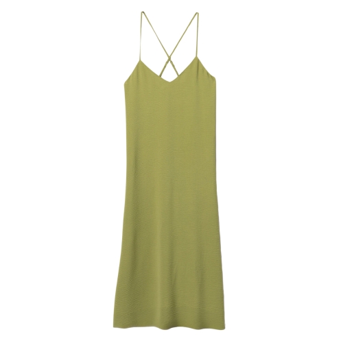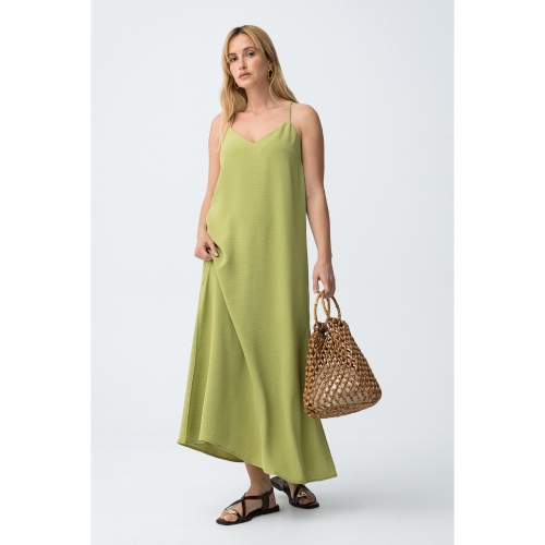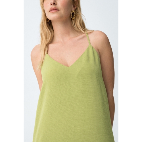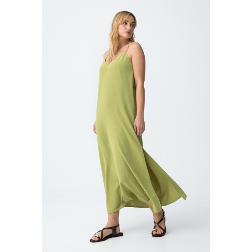 Mono oversize de color verde claro, corte amplio, tirantes finos y abertura lateral en las piernas.100% POLYESTER