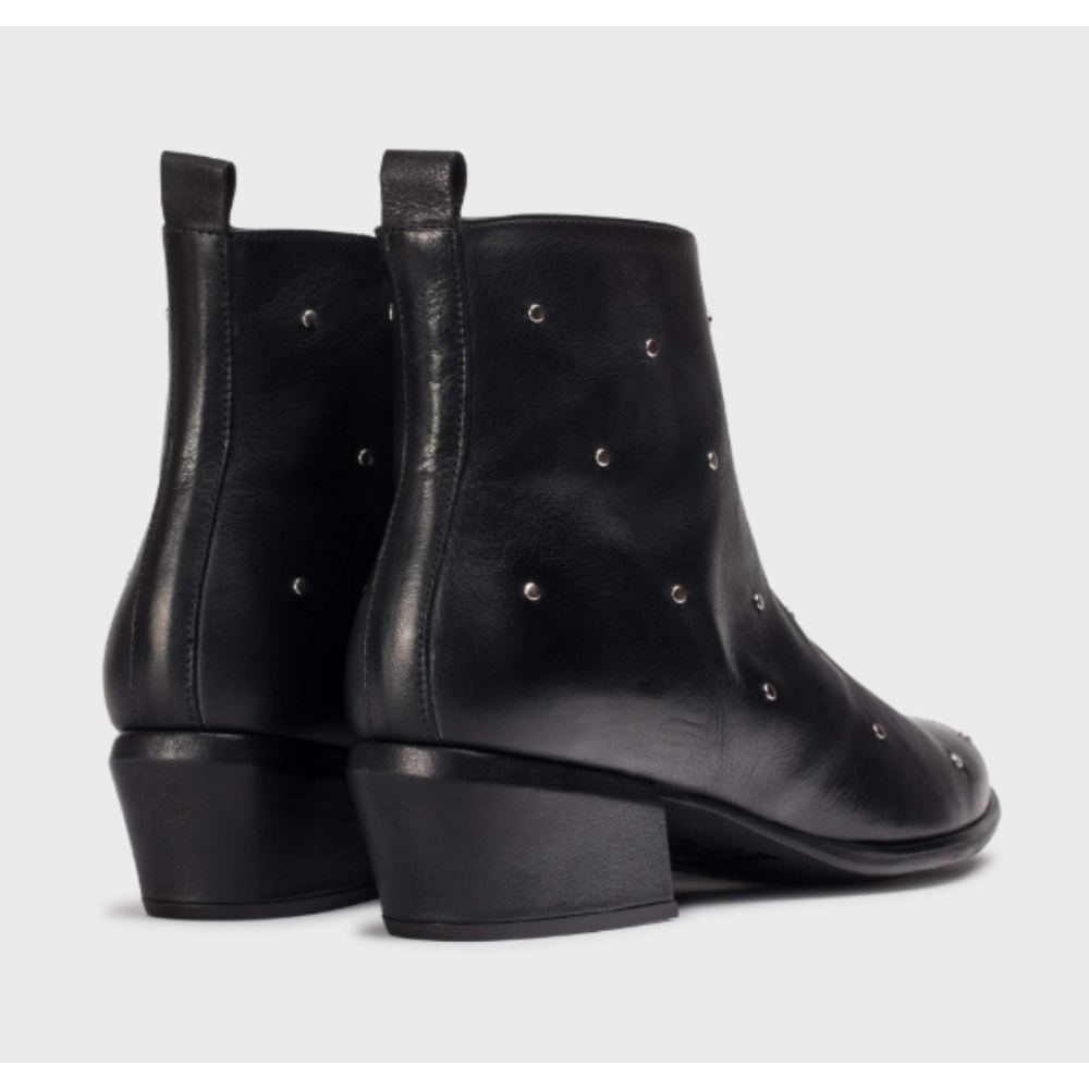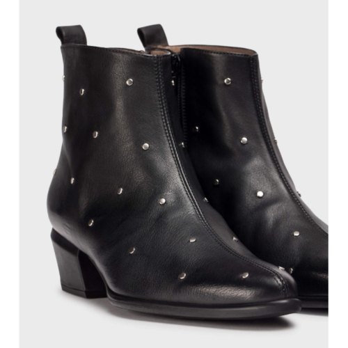 Botines FEI 02 confeccionados en piel negra con microtachas metálicas distribuidas por todo el empeine. Un diseño minimalista con inspiración western que combina líneas depuradas y una silueta estilizada con toques de carácter gracias a los detalles metálicos. Incorpora cremallera lateral interior para un ajuste cómodo y funcional, y tiradores en ambos talones del caño que refuerzan su estética urbana. El tacón de altura media aporta estabilidad sin renunciar a la sofisticación. La suela flexible aporta un extra de comodidad, combinado con la plantilla interior de MemoryGel que asegura una pisada amortiguada en cada paso. #madewithloveinSpain Wonders apoya la fabricación responsable vía LEATHERWORKINGGROUP.