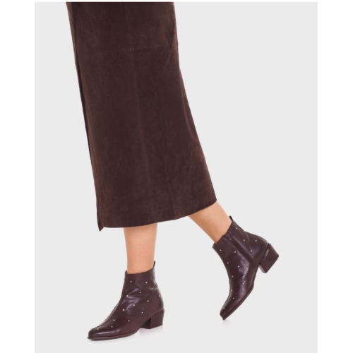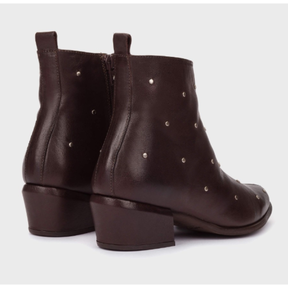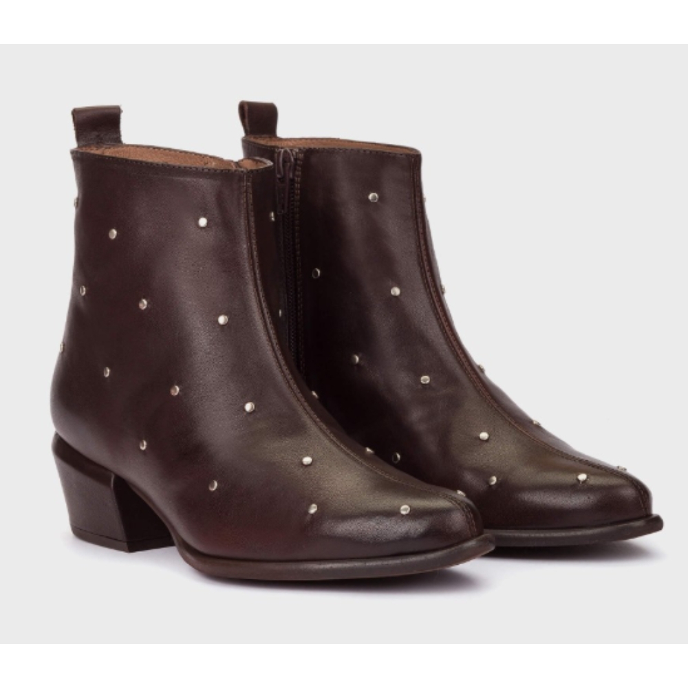 Botines FEI 02 fabricados en piel marrón con microtachas metálicas distribuidas por todo el empeine. Un diseño minimalista con inspiración western que combina líneas depuradas y una silueta estilizada con toques de carácter gracias a los detalles metálicos. Incorpora cremallera lateral interior para un ajuste cómodo y funcional, y tiradores en ambos talones del caño que refuerzan su estética urbana. El tacón de altura media aporta estabilidad sin renunciar a la sofisticación. La suela flexible aporta un extra de comodidad, combinado con la plantilla interior de MemoryGel que asegura una pisada amortiguada en cada paso. #madewithloveinSpain Wonders apoya la fabricación responsable vía LEATHERWORKINGGROUP.