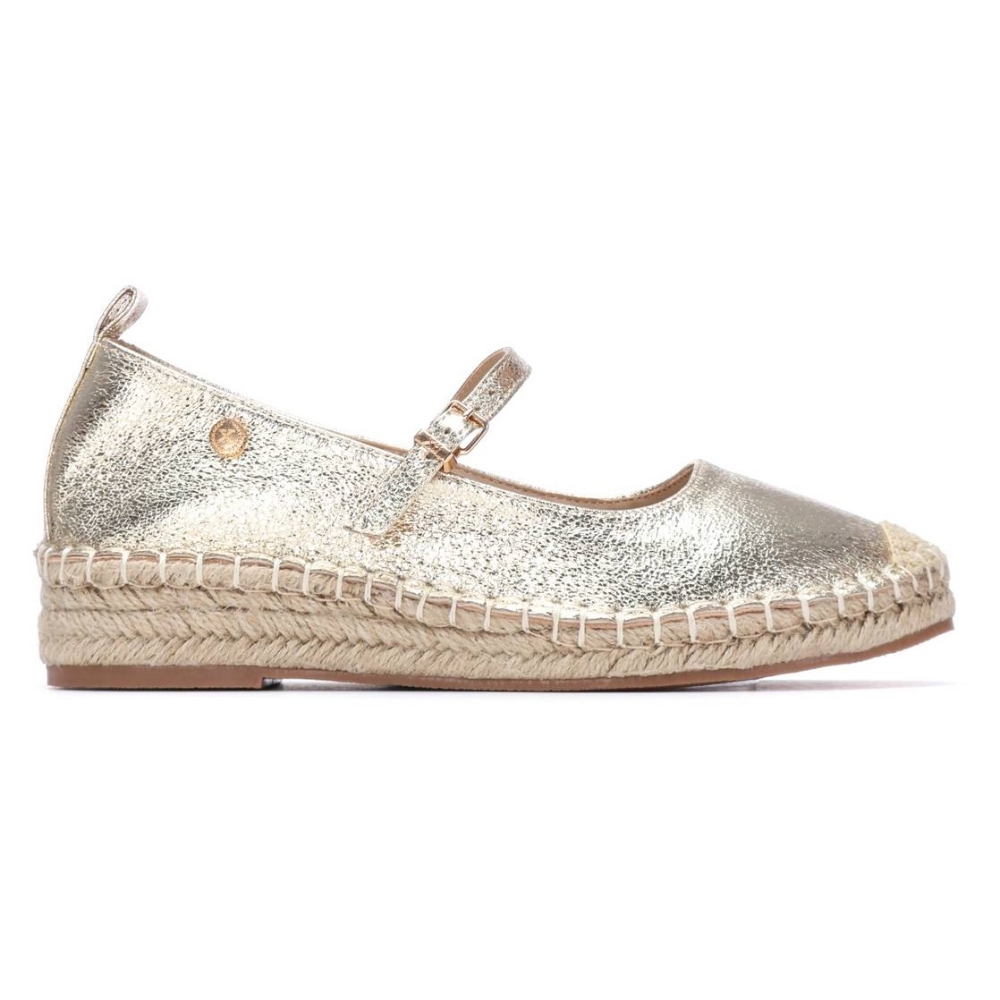Zapato de mujer, de la marca Xti. Fabricado en material  que imita la piel con acabado metalizado, que aporta un toque sofisticado y veraniego. Presenta una suela de esparto con una pequeña cuña, ideal para looks frescos y casuales. El modelo incluye una cinta con hebilla que aporta sujeción y un detalle decorativo distintivo. Cuenta con suela antideslizante, para mayor seguridad y comodidad en cada paso. Este modelo ha obtenido el certificado vegano por la organización mundial PETA (Organización de los derechos de los animales).