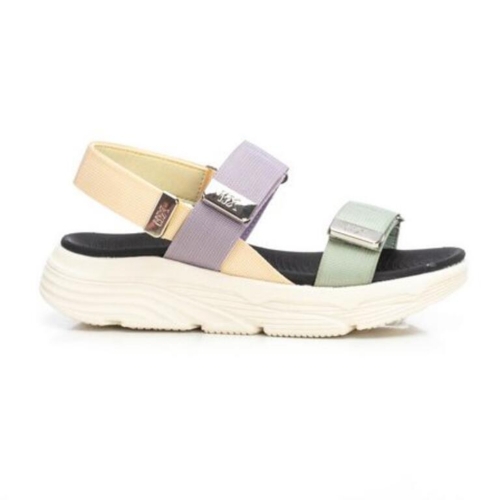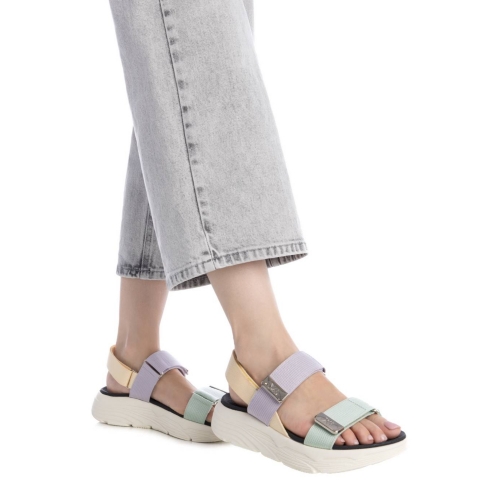 Sandalia de mujer, de la marca Xti. Fabricada en material que imita la piel con acabado metalizado. Diseño de tiras entrelazadas y pulsera en el tobillo con hebilla metálica. Pequeña cuña de 4 cm con suela antideslizante. Este modelo ha obtenido el certificado vegano por la organización mundial PETA (Organización de los derechos de los animales)