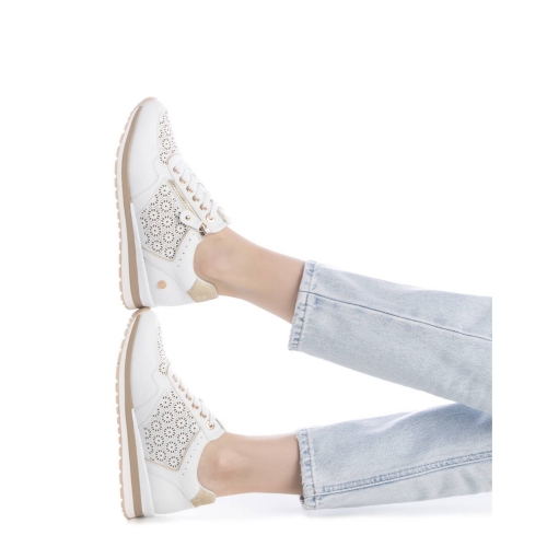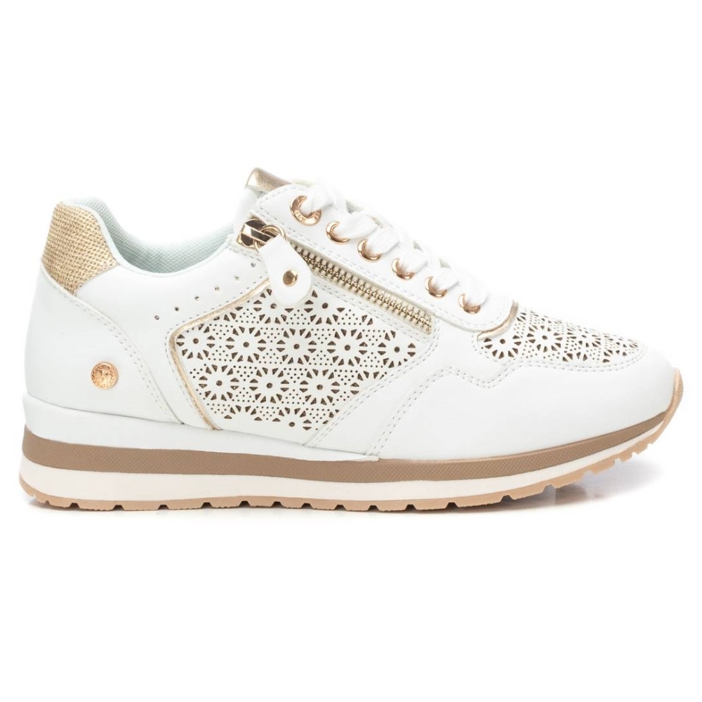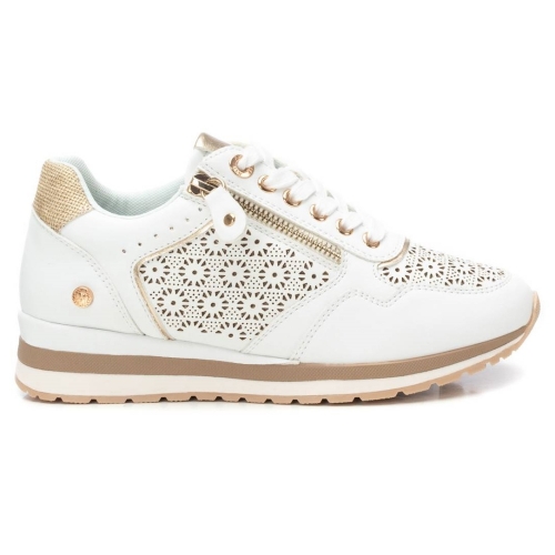 Zapatilla casual de mujer, de la marca Xti. Está fabricada en material que imita a la piel. Bonito troquelado en el lateral. Cordones al tono y cremallera con función en el lateral. Cuña bicolor con suela de goma antideslizante. Con plantilla extraíble. Este modelo ha obtenido el certificado vegano por la organización mundial PETA (Organización de los derechos de los animales).