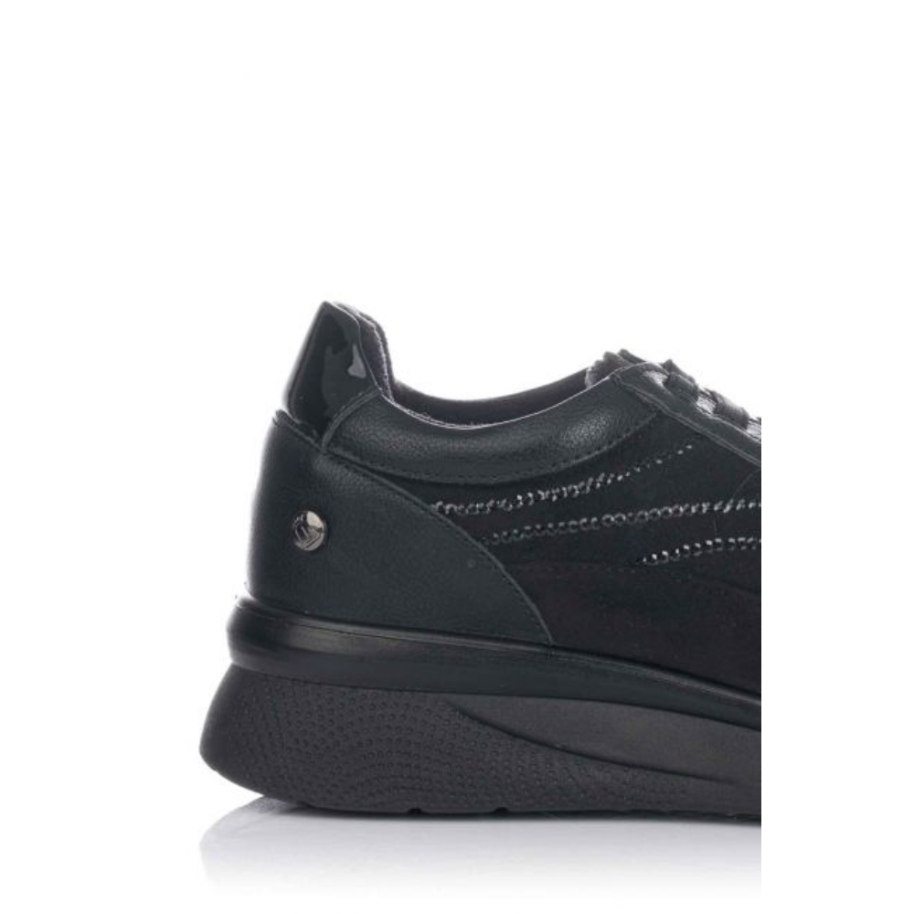 Zapato estilo confort con gomas elásticas de la marca Amarpies para mujer. Fabricado en material sintético con brillantes. Color negro