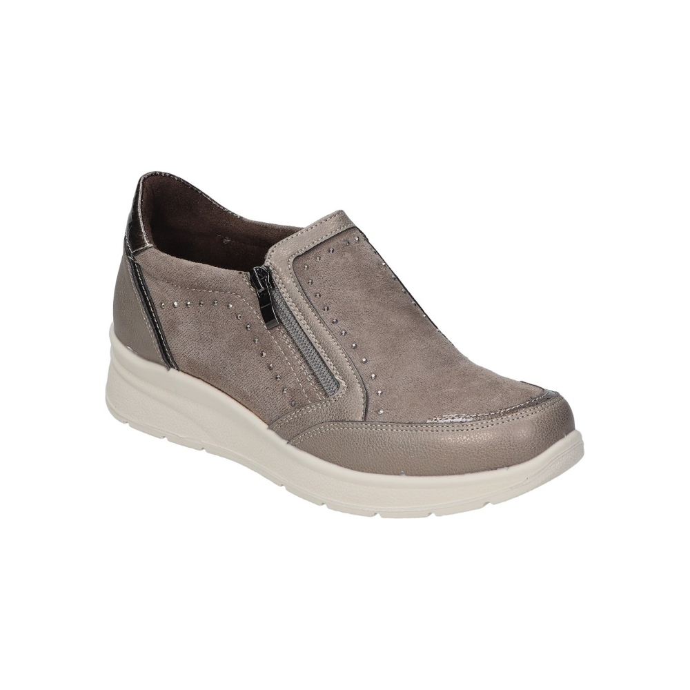 Zapato estilo mocasin confort con cremallera lateral y suela ligera. Color taupe