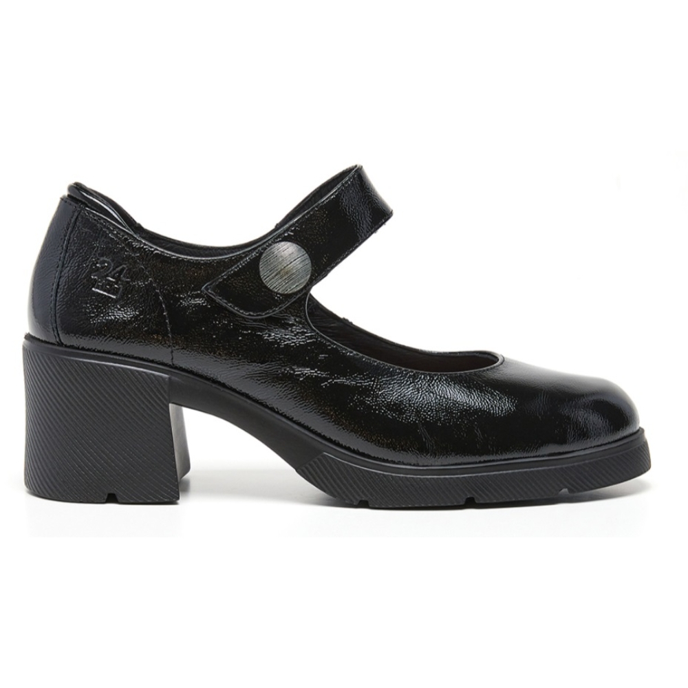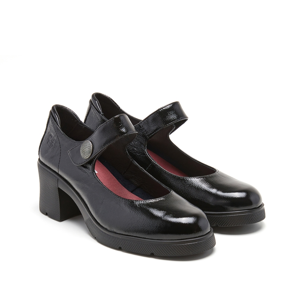 Zapato de tacon con pulsera en forma de velcro para una mayor comodidad y sujección. Fabricado en piel de gran calidad estilo charol, tacón y plataforma de goma antideslizante que aporta una gran amortiguacion. Color negro