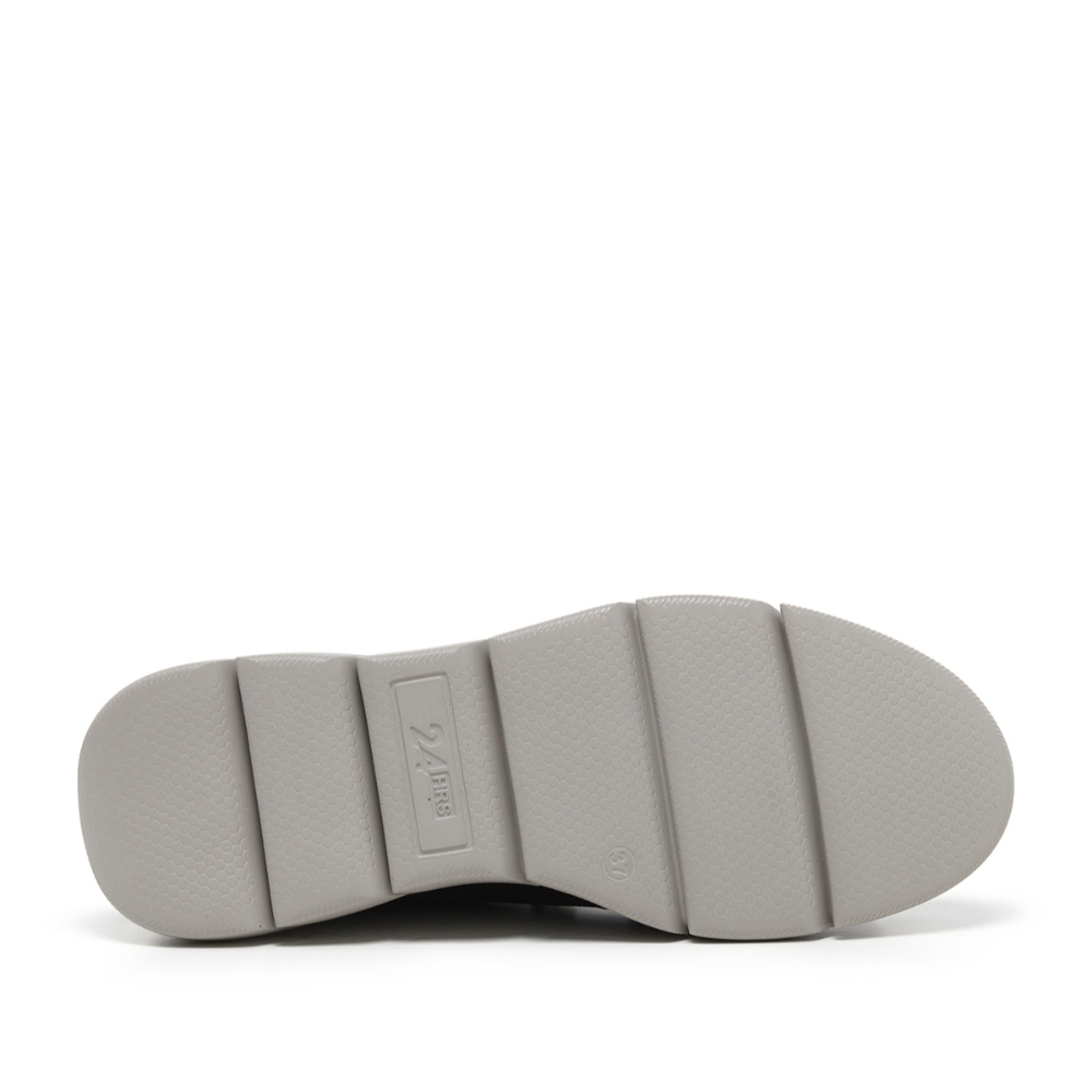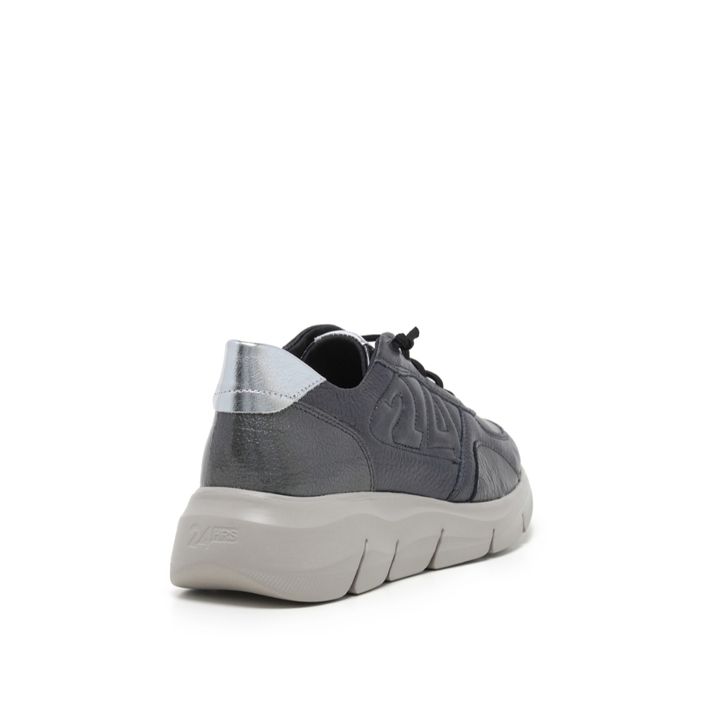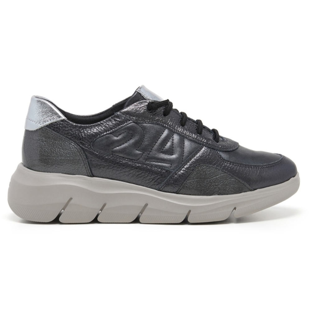 Deportiva 24 HRS en piel combinada con acabado metalizado y charol gris. Cierre mediante cordón elástico y plantilla extraíble para mayor confort. Suela de EVA ultraligera con altura de 5 cm y tecnología The Lightest, que proporciona ligereza