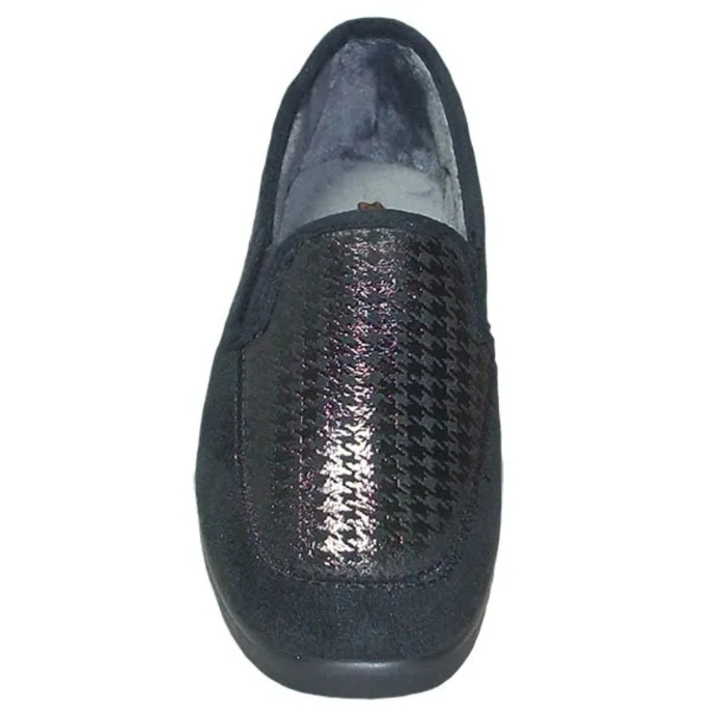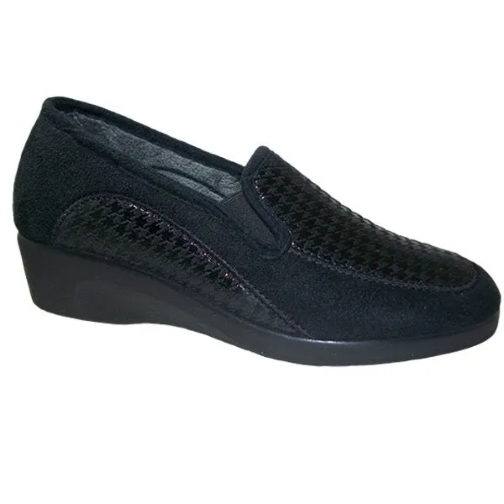 Zapatilla tipo mocasin de la marca Devalverde para mujer. Ideal para hogar o calle con suela de goma antideslizante con cuña media. Color negro