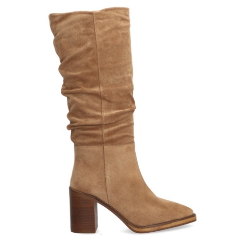 Bota alta de Alpe confeccionada en serraje en color taupe. Diseño arrugado en la caña que le aporta un estilo desenfadado. Tacón ancho de mandera de aproximadamente 8 cm de estiliza la figura. Ideal para combinar con vestidos. Fabricada en España