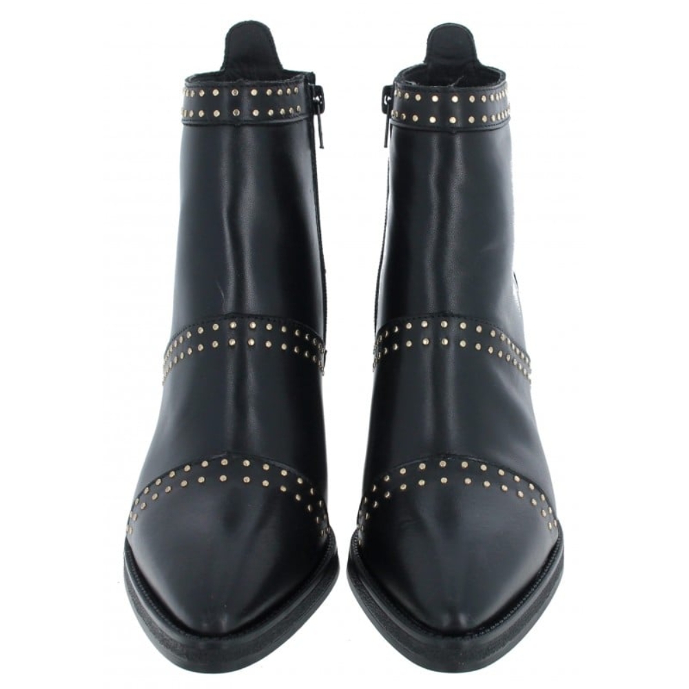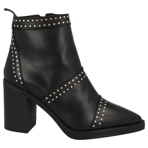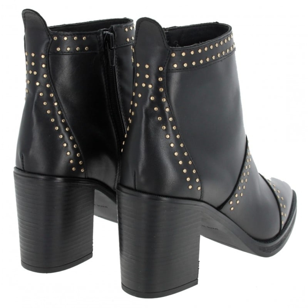 Los botines Alpe Camden para mujer en piel negra combinan sofisticación y comodidad. Están confeccionados en piel de primera calidad con un suave acabado de seda baby y forro textil transpirable. Con una elegante punta y sutiles detalles de tachuelas doradas, se asientan sobre un robusto tacón de bloque de 8,5 cm que les da un toque favorecedor. Una práctica cremallera lateral facilita su uso, mientras que la suela antideslizante proporciona una estabilidad fiable, lo que los convierte en perfectos tanto para looks informales como elegantes.