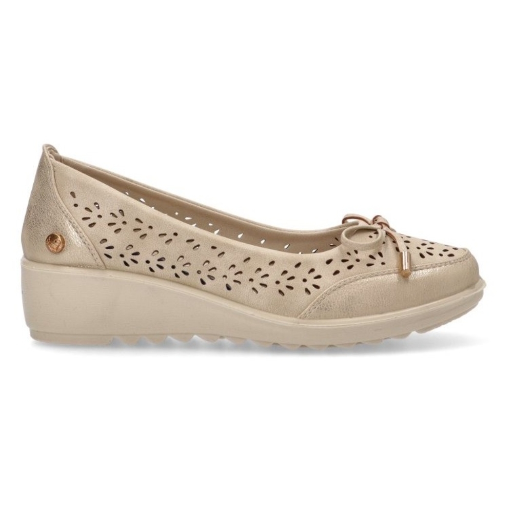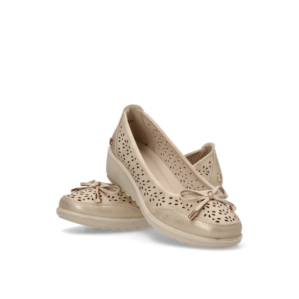 Bailarina con cuña baja de la marca Amarpies para mujer. Faricada en material sintético picado con lazo en el empeine con toques dorados ideales para fiesta o diario. Color beig