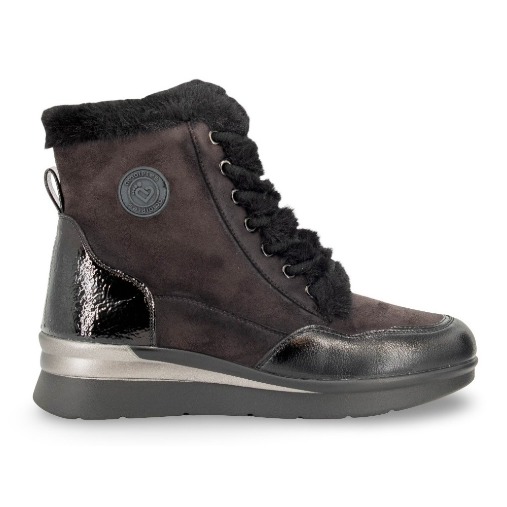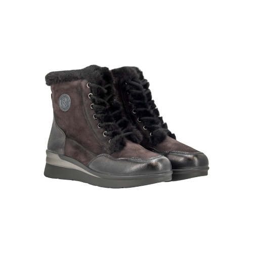 Botin con cuña baja y plataforma de la marca Amarpies para mujer. Fabricado en material sintético con detalle de pelo en los cordones, cremallera lateral para una mayor comodidad. Color negro