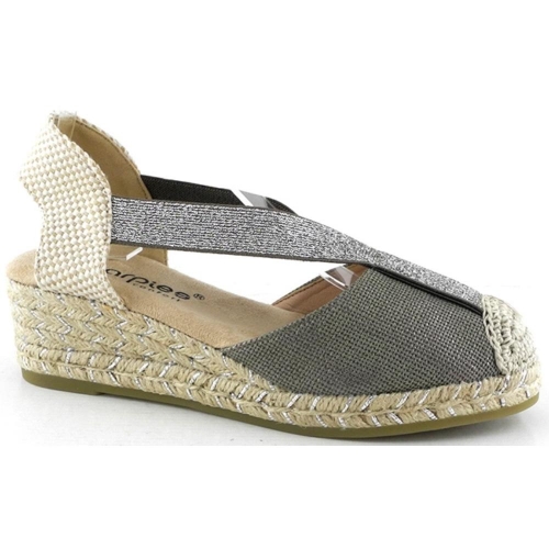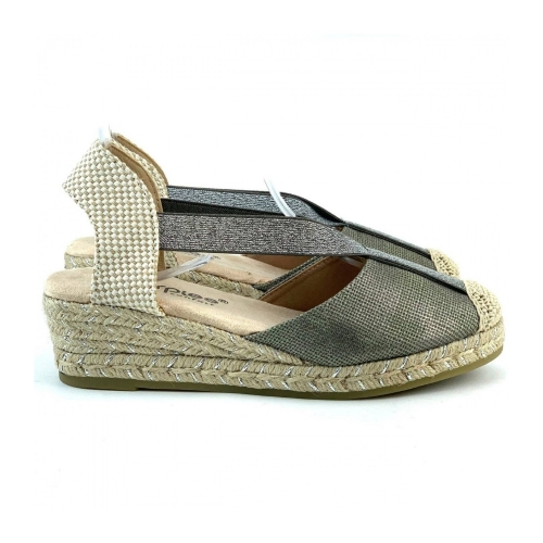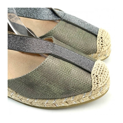 Alpargata estilo valenciana con cuña media de yute para mujer. Fabricada en material textil, ligero y transpirable con gomas elásticas en el empeine para un mayor ajuste y comodidad. Color kaki