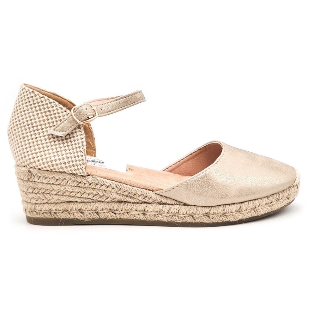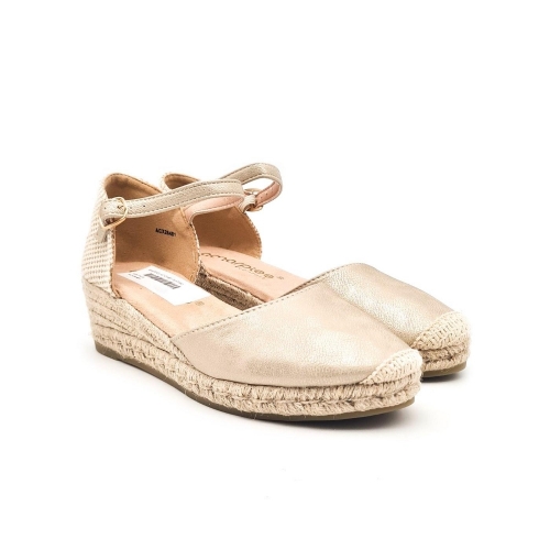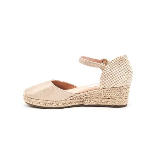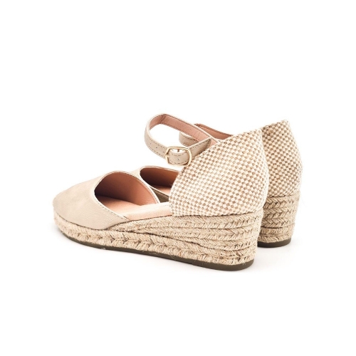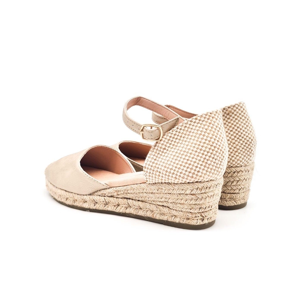 Sandalia de yute puntera y talón cerrados muy fresca para el buen tiempo, estilo alpargata valenciana, corte de tela, en color platino, adorno de puntera reforzada. Para una mejor sujeción lleva una pulsera tobillera en polipiel color beig, con cierre de hebilla. Forro de la pala en tela en color platino. Planta muy suave imitación serraje en tono beig acolchada memory foam que se adapta a la anatomía plantar y disminuye la fatiga. Suela de goma en tono caramelo con cuña de esparto de 4 cuerdas (4 cm. de altura en la parte del talón) y piso de 1 cuerdas (1 cm. de altura en la parte de la puntera).