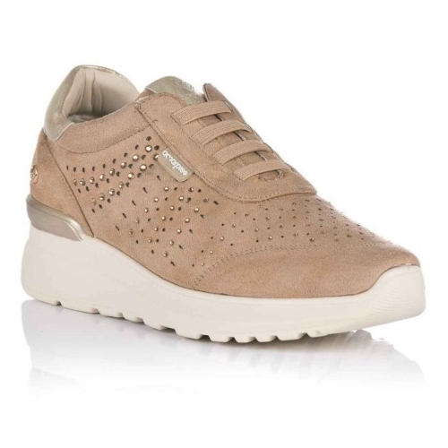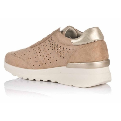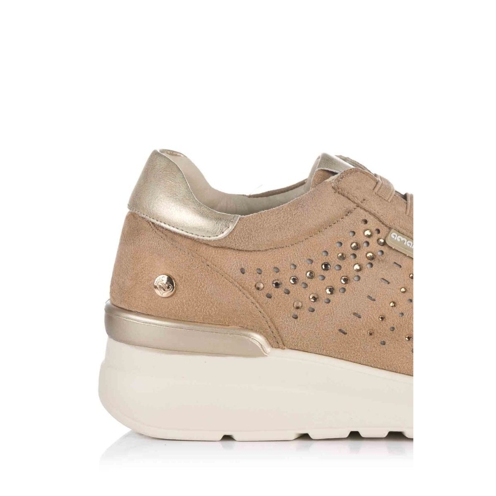 Zapato sport de la marca Amarpies para mujer, realizado textil ante perforado para una mayor transpiración, con pequeñas incrustaciones brillantes a lo largo de todo el modelo. Plantilla extraíble acolchada “Memory esponge ” que amortigua la pisada y se adapta a la forma del pie y su cierre con cordones elásticos facilita el calce. Modelo cómodo pensado para un uso diario combinable con varios estilos.
